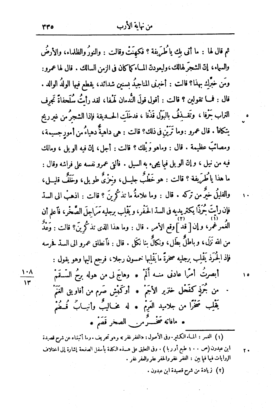 ما هذا يا طريفة؟ قالت: هو خطب جليل، وخزى طويل، وخلف قليل، والقليل خير من تركه. قال: وما علامة ما تذكرين؟ قالت: اذهب الى السدّ فإن رأيت جرذا يكثر يديه فى السدّ الحفر، ويقلب برجليه مراجل الصّخر، فاعلم أن الغمر غمر «1» ، وإن [قد «2» ] وقع الأمر. قال: وما هذا الذى تذكرين؟ قالت: وعد من الله نزل، وباطل بطل، ونكال بنا نكل. قال: فانطلق عمرو الى السدّ فحرسه فإذا لجرذ يقلب برجليه صخرة ما يقلبها خمسون رجلا، فرجع إليها وهو يقول: