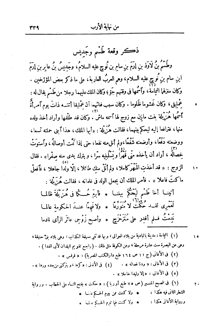 وطسم بن لاوذ بن إرم بن سام بن نوح عليه السلام، وجديس بن عابر بن إرم ابن سام بن نوح عليه السلام، وهم العرب العاربة، على ما ذكر بعض المؤرّخين.