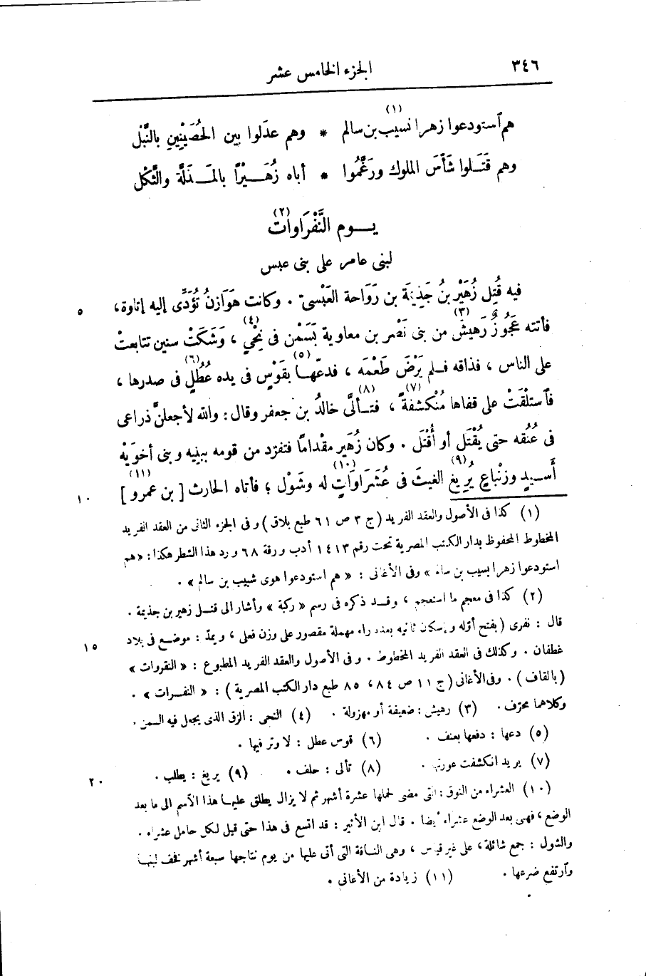 فيه قتل زهير بن جذيمة بن رواحة العبسىّ. وكانت هوازن تؤدّى إليه إتاوة، فأتته عجوز رهيش «3» من بنى نصر بن معاوية بسمن فى نحى «4» ، وشكت سنين تتابعت على الناس، فذاقه فلم يرض طعمه، فدعّها «5» بقوس فى يده عطل «6» فى صدرها، فاستلقت على قفاها منكشفة «7» ، فتألّى «8» خالد بن جعفر وقال: والله لأجعلنّ ذراعى فى عنقه حتى يقتل أو أقتل. وكان زهير مقداما فتفرّد من قومه ببنيه وبنى أخويه أسيد وزنباع يريغ «9» الغيث فى عشراوات «10» له وشول؛ فأتاه الحارث [بن عمرو «11» ]