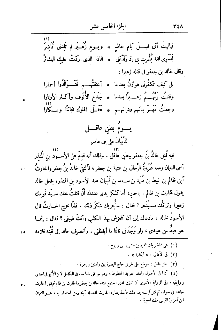 فيه قتل خالد بن جعفر ببطن عاقل «3» . وذلك أنه قدم على الأسود «4» بن المنذر أخى النعمان ومعه عروة الرّحال بن عتبة بن جعفر، فالتقى خالد بن جعفر والحارث ابن ظالم بن غيط بن مرّة بن سعد بن ذبيان عند الأسود بن المنذر، فجعل خالد يقول للحارث بن ظالم: يا حار، أما تشكر يدى عندك أن قتلت عنك سيّد قومك زهيرا وتركتك سيّدهم؟ فقال: سأجزيك شكر ذلك. فلمّا خرج الحارث قال الأسود لخالد: ما دعاك إلى أن تتحرّش بهذا الكلب وأنت ضيفى؟ فقال: إنما هو عبد من عبيدى، ولو وجدنى نائما ما أيقظنى. وانصرف خالد إلى قبّته فلامه