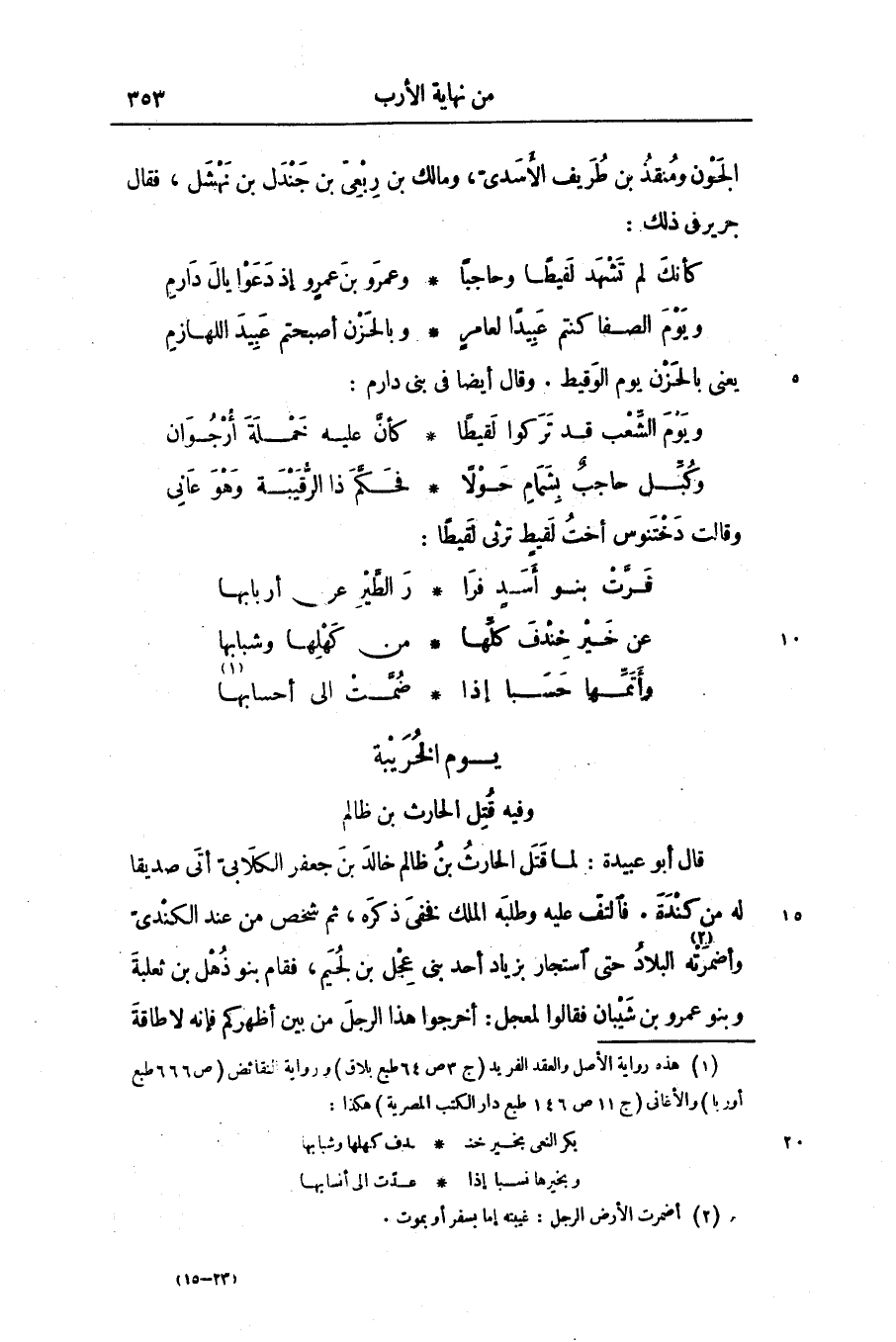 قال أبو عبيدة: لما قتل الحارث بن ظالم خالد بن جعفر الكلابىّ أتى صديقا له من كندة. فالتفّ عليه وطلبه الملك فخفى ذكره، ثم شخص من عند الكندىّ وأضمرته «2» البلاد حتى استجار بزياد أحد بنى عجل بن لجيم، فقام بنو ذهل بن ثعلبة وبنو عمرو بن شيبان فقالوا لمعجل: أخرجوا هذا الرجل من بين أظهركم فإنه لا طاقة