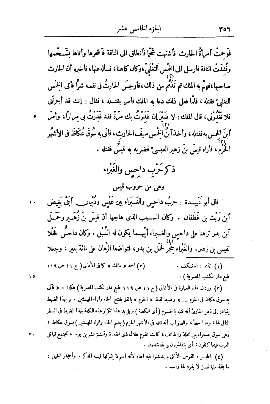 فوحمت امرأة الحارث فاشتهت شحما فانطلق الى الناقة فانتحرها وأتاها بشحمها وفقدت الناقة فأرسل الى الخمس التغلبىّ، وكان كاهنا، فسأله عنها، فأخبره أنّ الحارث صاحبها، فهمّ به الملك ثم تذمّم «1» من ذلك، فأوجس الحارث فى نفسه شرّا فأتى الخمس التغلبىّ فقتله، فلمّا فعل ذلك دعا به الملك فأمر بقتله، فقال: إنك قد أجرتنى فلا تغدرنى، قال الملك: لا ضير إن غدرت بك مرّة فقد غدرت بى مرارا، وأمر ابن الخمس به فقتله، وأخذ ابن «2» الخمس سيف الحارث، فأتى به سوق عكاظ فى الأشهر الحرم «3» ، فأراه قيس بن زهير العبسىّ فضربه به قيس فقتله.