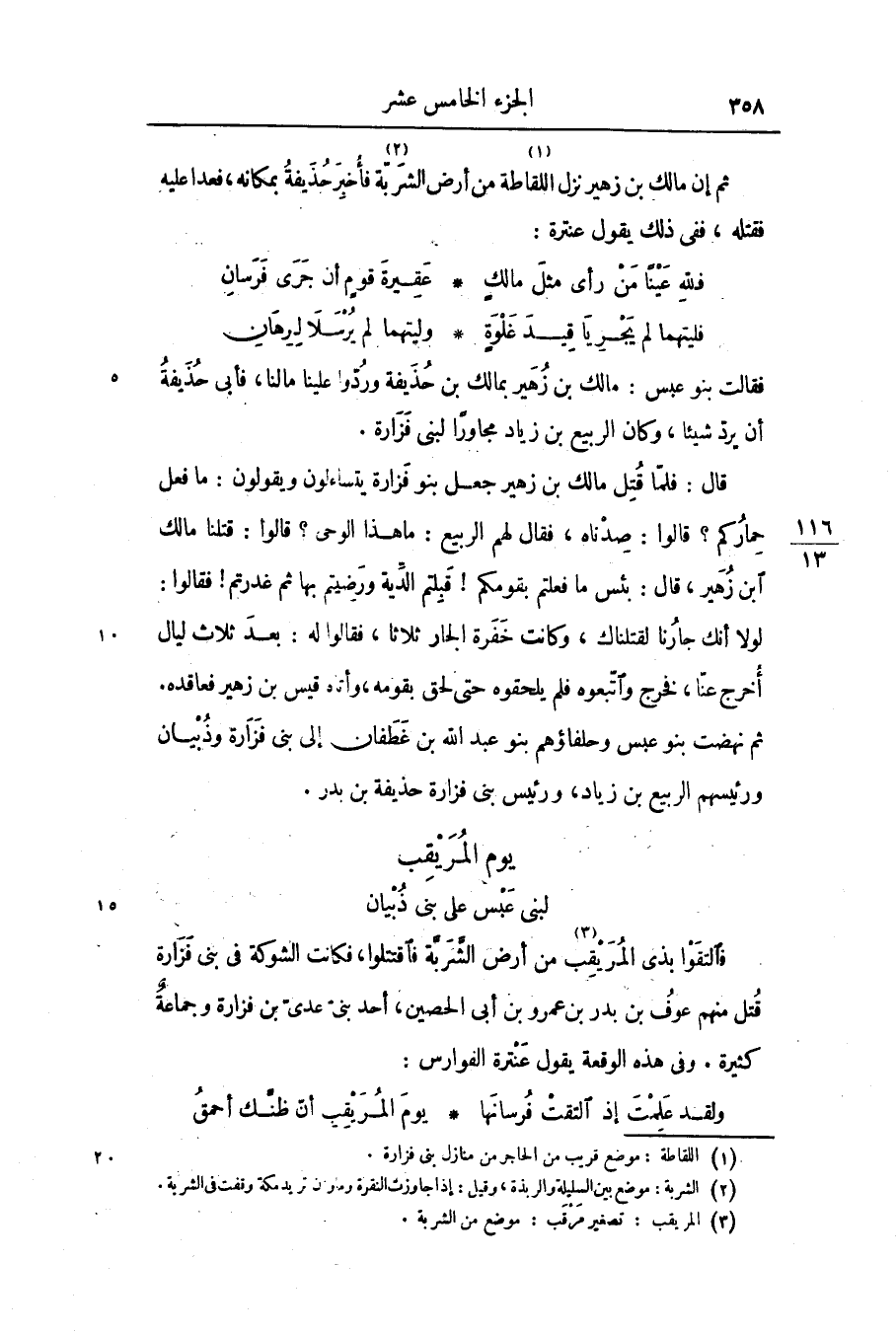 فالتقوا بذى المريقب «3» من أرض الشّربّة فاقتتلوا، فكانت الشوكة فى بنى فزارة قتل منهم عوف بن بدر بن عمرو بن أبى الحصين، أحد بنىّ عدىّ بن فزارة وجماعة كثيرة. وفى هذه الوقعة يقول عنترة الفوارس: