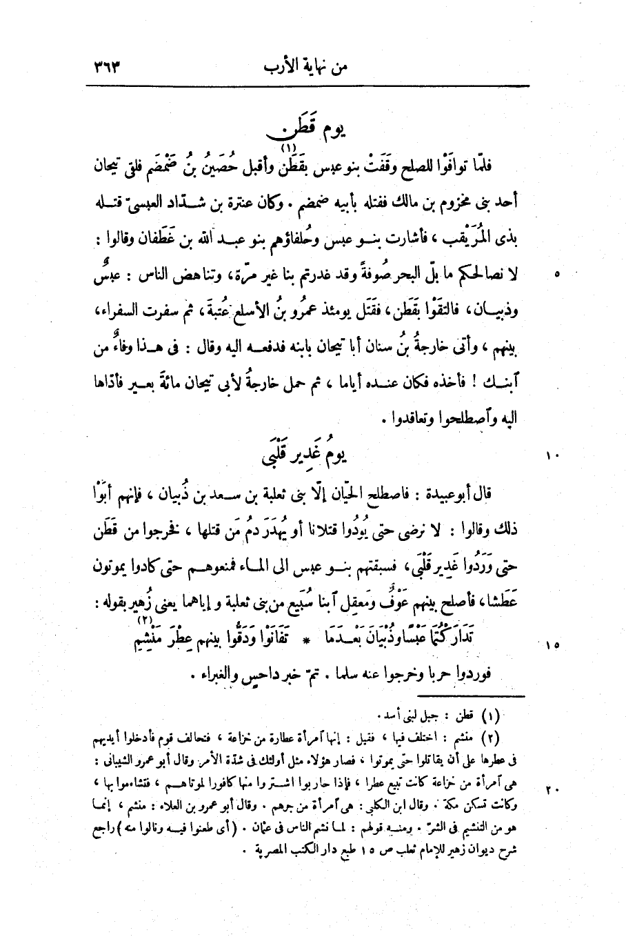 قال أبو عبيدة: فاصطلح الحيّان إلّا بنى ثعلبة بن سعد بن ذبيان، فإنهم أبوا ذلك وقالوا: لا نرضى حتى يودوا قتلانا أو يهدر دم من قتلها، فخرجوا من قطن حتى وردوا غدير قلبى، فسبقتهم بنو عبس الى الماء فمنعوهم حتى كادوا يموتون عطشا، فأصلح بينهم عوف ومعقل ابنا سبيع من بنى ثعلبة وإياهما يعنى زهير بقوله: