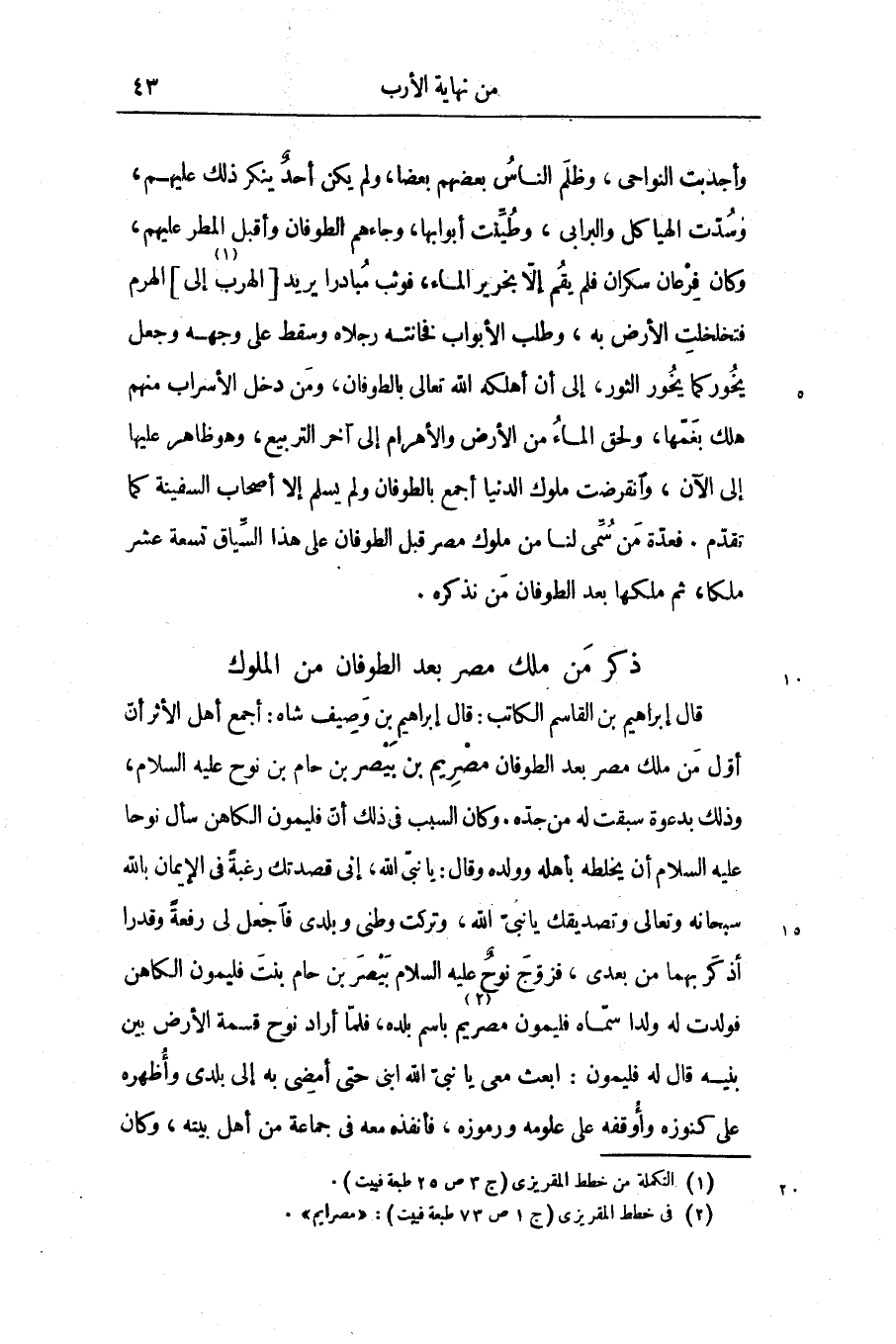قال إبراهيم بن القاسم الكاتب: قال إبراهيم بن وصيف شاه: أجمع أهل الأثر أنّ أوّل من ملك مصر بعد الطوفان مصريم بن بيصر بن حام بن نوح عليه السلام، وذلك بدعوة سبقت له من جدّه. وكان السبب فى ذلك أنّ فليمون الكاهن سأل نوحا عليه السلام أن يخلطه بأهله وولده وقال: يا نبىّ الله، إنى قصدتك رغبة فى الإيمان بالله سبحانه وتعالى وتصديقك يا نبىّ الله، وتركت وطنى وبلدى فاجعل لى رفعة وقدرا أذكر بهما من بعدى، فزوّج نوح عليه السلام بيصر بن حام بنت فليمون الكاهن فولدت له ولدا سمّاه فليمون مصريم «2» باسم بلده، فلمّا أراد نوح قسمة الأرض بين بنيه قال له فليمون: ابعث معى يا نبىّ الله ابنى حتى أمضى به إلى بلدى وأظهره على كنوزه وأوقفه على علومه ورموزه، فأنفذه معه فى جماعة من أهل بيته، وكان