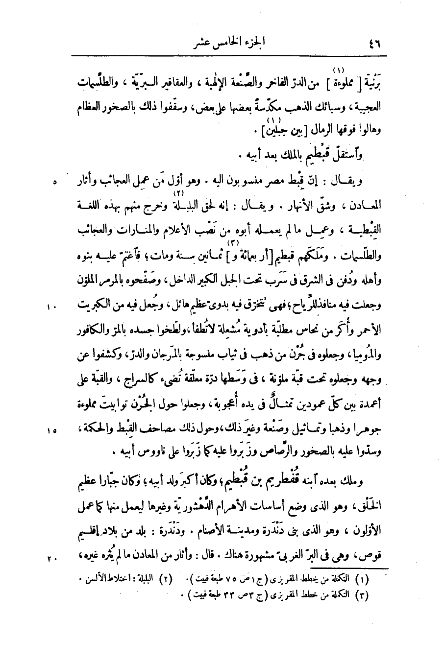 ويقال: إنّ قبط مصر منسوبون اليه. وهو أوّل من عمل العجائب وأثار المعادن، وشقّ الأنهار. ويقال: إنه لحق البلبلة «3» وخرج منهم بهذه اللغة القبطية، وعمل ما لم يعمله أبوه من نصب الأعلام والمنارات والعجائب والطلّسمات. وملكهم قبطيم [أربعمائة و «4» ] ثمانين سنة ومات؛ فاغتمّ عليه بنوه وأهله ودفن فى الشرق فى سرب تحت الجبل الكبير الداخل، وصفّحوه بالمرمر الملوّن وجعلت فيه منافذ للرّياح؛ فهى تتخرق فيه بدوىّ عظيم هائل، وجعل فيه من الكبريت الأحمر وأكر من نحاس مطليّة بأدوية مشعلة لاتطفأ، ولطّخوا جسده بالمرّ والكافور والموميا، وجعلوه فى جرن من ذهب فى ثياب منسوجة بالمرجان والدرّ، وكشفوا عن وجهه وجعلوه تحت قبّة ملوّنة، فى وسطها درّة معلّقة تضىء كالسراج، والقبّة على أعمدة بين كلّ عمودين تمثال فى يده أعجوبة، وجعلوا حول الجرن توابيت مملوءة جوهرا وذهبا وتماثيل وصنعة وغير ذلك، وحول ذلك مصاحف القبط والحكمة، وسدّوا عليه بالصخور والرّصاص وزبروا عليه كما زبروا على ناووس أبيه.