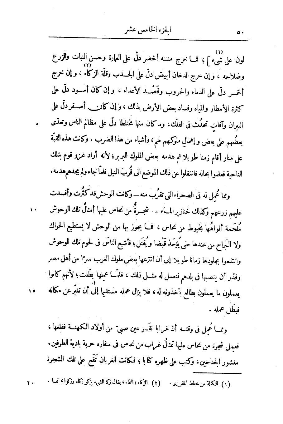 ومما عمل له فى الصحراء التى تقرب منه- وكانت الوحش قد كثرت وأفسدت عليهم زرعهم وكذلك خنازير الماء- شجرة من نحاس عليها أمثال تلك الوحوش ملجمة أفواهها بخيوط من نحاس، فما يجوز بها من الوحش لا يستطيع الحراك ولا البراح من عندها حتى يؤخذ قبضا ويقتل؛ فأشبع الناس فى لحوم تلك الوحوش وانتفعوا بجلودها زمانا طويلا إلى أن انتزعها بعض ملوك الغرب سرّا من أهل مصر وقدّر أن ينصبها فى بلدهم فتعمل له مثل ذلك، فلمّا عملها بطلت؛ لأنهم كانوا يعملون ما يعملون بطالع يأخذونه له، فلا يزال عمله مستقيما إلى أن تغيّر عن مكانه فبطل عمله.