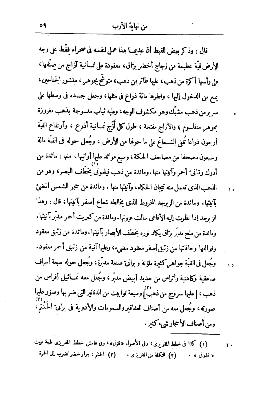 قال: وذكر بعض القبط أنّ عديما هذا عمل لنفسه فى صحراء قفط على وجه الأرض قبّة عظيمة من زجاج أخضر برّاق، معقودة على ثمانية آزاج من صنفها، على رأسها أكرة من ذهب، عليها طائر من ذهب، متوشّح بجوهر، منشور الجناحين، يمنع من الدخول إليها، وقطرها مائة ذراع فى مثلها، وجعل جسده فى وسطها على سرير من ذهب مشبّك وهو مكشوف الوجه، وعليه ثياب منسوجة بذهب مغروزة بجوهر منظوم؛ والآزاج مفتحة، طول كل أزج ثمانية أذرع، وارتفاع القبّة أربعون ذراعا تلقى الشعاع على ما حولها من الأرض، وجعل حوله فى القبّة مائة وسبعون مصحفا من مصاحف الحكمة، وسبع موائد عليها أوانيها، منها: مائدة من أدرك رمّانىّ أحمر وآنيتها منها. ومائدة من ذهب فيلمونى «1» يخطف البصر، وهو من الذهب الذى تعمل منه تيجان الحكماء، وآنيتها منها. ومائدة من حجر الشمس المضئ بآنيتها. ومائدة من الزبرجد المخروط الذى يخالطه شعاع أصفر بآنيتها، قال: وهذا الزبرجد إذا نظرت إليه الأفاعى سالت عيونها. ومائدة من كبريت أحمر ومدبّر بآنيتها.