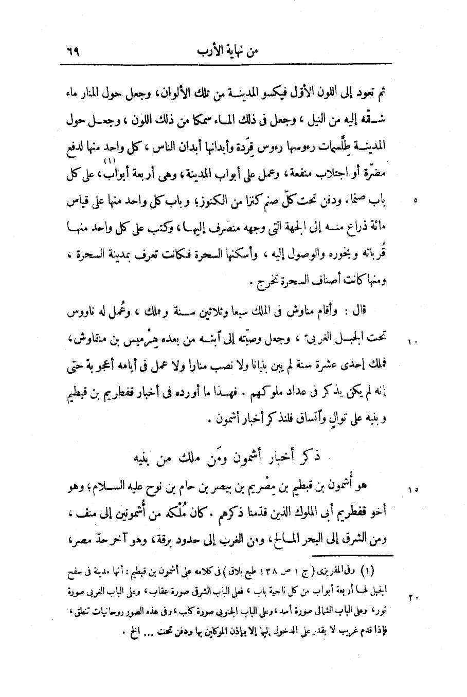 ثم تعود إلى اللون الأوّل فيكسو المدينة من تلك الألوان، وجعل حول المنار ماء شقّه إليه من النيل، وجعل فى ذلك الماء سمكا من ذلك اللون، وجعل حول المدينة طلّسمات رءوسها رءوس قردة وأبدانها أبدان الناس، كل واحد منها لدفع مضرّة أو اجتلاب منفعة، وعمل على أبواب المدينة، وهى أربعة أبواب «1» ، على كل باب صنما، ودفن تحت كلّ صنم كنزا من الكنوز؛ وباب كل واحد منها على قياس مائة ذراع منه إلى الجهة التى وجهه منصرف إليها، وكتب على كل واحد منها قربانه وبخوره والوصول إليه، وأسكنها السحرة فكانت تعرف بمدينة السحرة، ومنها كانت أصناف السحرة تخرج.