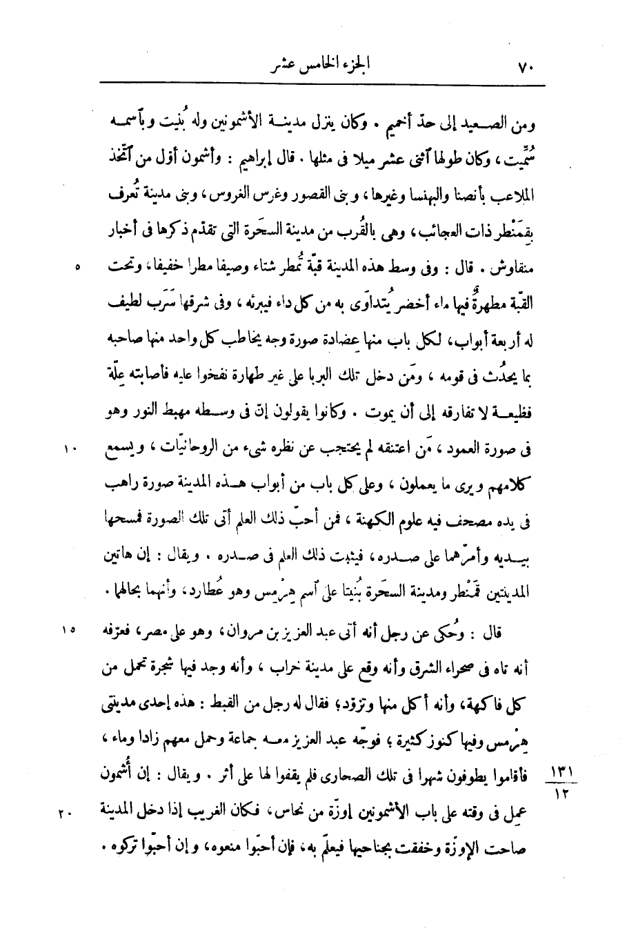 ومن الصعيد إلى حدّ أخميم. وكان ينزل مدينة الأشمونين وله بنيت وباسمه سمّيت، وكان طولها اثنى عشر ميلا فى مثلها. قال إبراهيم: وأشمون أوّل من اتّخذ الملاعب بأنصنا والبهنسا وغيرها، وبنى القصور وغرس الغروس، وبنى مدينة تعرف بقمنطر ذات العجائب، وهى بالقرب من مدينة السحرة التى تقدّم ذكرها فى أخبار منقاوش. قال: وفى وسط هذه المدينة قبّة تمطر شتاء وصيفا مطرا خفيفا، وتحت القبّة مطهرة فيها ماء أخضر يتداوى به من كل داء فيبرئه، وفى شرقها سرب لطيف له أربعة أبواب، لكل باب منها عضادة صورة وجه يخاطب كل واحد منها صاحبه بما يحدث فى قومه، ومن دخل تلك البربا على غير طهارة نفخوا عليه فأصابته علّة فظيعة لا تفارقه إلى أن يموت. وكانوا يقولون إنّ فى وسطه مهبط النور وهو فى صورة العمود، من اعتنقه لم يحتجب عن نظره شىء من الروحانيّات، ويسمع كلامهم ويرى ما يعملون، وعلى كل باب من أبواب هذه المدينة صورة راهب فى يده مصحف فيه علوم الكهنة، فمن أحبّ ذلك العلم أتى تلك الصورة فمسحها بيديه وأمرّهما على صدره، فيثبت ذلك العلم فى صدره. ويقال: إن هاتين المدينتين قمنطر ومدينة السحرة بنيتا على اسم هرمس وهو عطارد، وأنهما بحالهما.