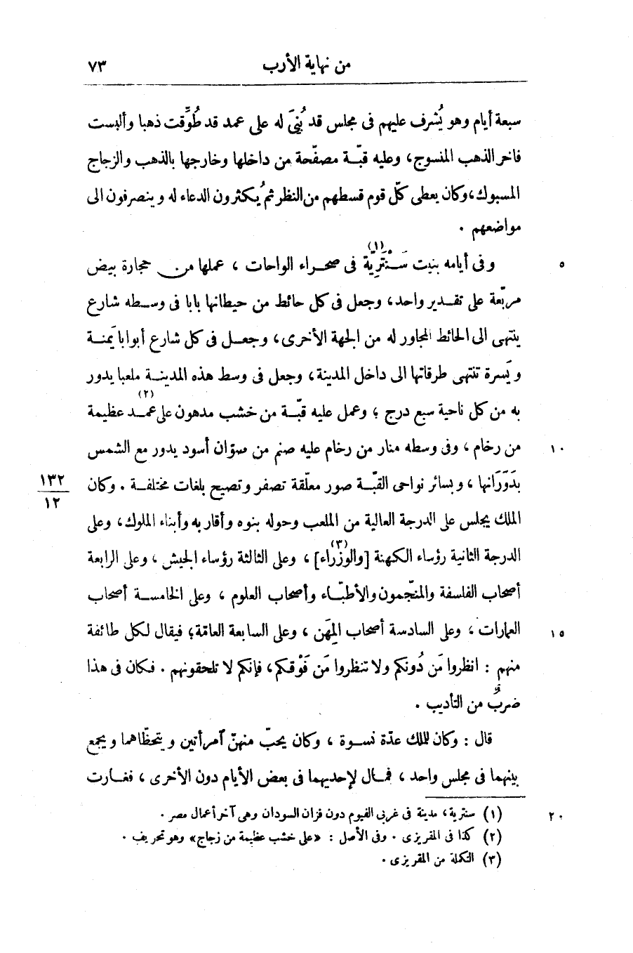 وفى أيامه بنيت سنتريّة «1» فى صحراء الواحات، عملها من حجارة بيض مربّعة على تقدير واحد، وجعل فى كل حائط من حيطانها بابا فى وسطه شارع ينتهى الى الحائط المجاور له من الجهة الأخرى، وجعل فى كل شارع أبوابا يمنة ويسرة تنتهى طرقاتها الى داخل المدينة، وجعل فى وسط هذه المدينة ملعبا يدور به من كل ناحية سبع درج؛ وعمل عليه قبّة من خشب مدهون على عمد «2» عظيمة من رخام، وفى وسطه منار من رخام عليه صنم من صوّان أسود يدور مع الشمس بدورانها، وبسائر نواحى القبّة صور معلّقة تصفر وتصيح بلغات مختلفة. وكان الملك يجلس على الدرجة العالية من الملعب وحوله بنوه وأقار به وأبناء الملوك، وعلى الدرجة الثانية رؤساء الكهنة [والوزراء «3» ] ، وعلى الثالثة رؤساء الجيش، وعلى الرابعة أصحاب الفلسفة والمنّجمون والأطبّاء وأصحاب العلوم، وعلى الخامسة أصحاب العمارات، وعلى السادسة أصحاب المهن، وعلى السابعة العامّة؛ فيقال لكل طائفة منهم: انظروا من دونكم ولا تنظروا من فوقكم، فإنكم لا تلحقونهم. فكان فى هذا ضرب من التأديب.