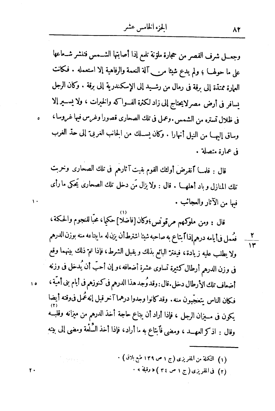 وجعل شرف القصر من حجارة ملوّنة تلمع إذا أصابتها الشمس فتنشر شعاعها على ما حولها؛ ولم يدع شيئا من آلة النعمة والرفاهية إلا استعمله. فكانت العمارة ممتدّة إلى برقة فى رمال من رشيد إلى الإسكندرية إلى برقة. وكان الرجل يسافر فى أرض مصر لا يحتاج إلى زاد لكثرة الفواكه والخيرات، ولا يسير إلا فى ظلال تستره من الشمس. وعمل فى تلك الصحارى قصورا وغرس فيها غروسا، وساق إليها من النيل أنهارا. وكان يسلك من الجانب الغربىّ إلى حدّ الغرب فى عمارة متصلة.