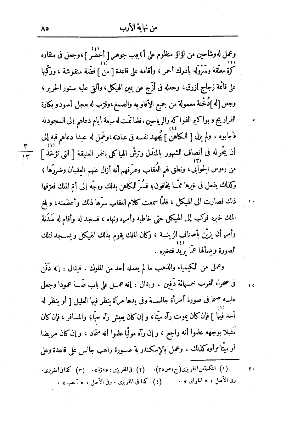 وعمل له وشاحين من لؤلؤ منظوم على أنابيب جوهر [أخضر «1» ] ، وجعل فى منقاره كرة «2» معلّقة وسروله بأدرك أحمر، وأقامه على قاعدة [من «3» ] فضّة منقوشة، وركّبها على قائمة زجاج أزرق، وجعله فى أزج عن يمين الهيكل، وألقى عليه ستور الحرير، وجعل [له] دخنة معمولة من جميع الأفاويه والصمغ، وقرّب له بعجل أسود وبكارة الفراريج وبواكير الفواكه والرياحين. فلما تمّت له سبعة أيام دعاهم إلى السجود له فأجابوه. ولم يزل [الكاهن «4» ] يجهد نفسه فى عبادته، وعمل له عيدا دعاهم فيه إلى أن يبخّر له فى أنصاف الشهور بالمندل وترشّ الهياكل بالخمر العتيقة [التى تؤخذ «5» ] من رءوس الجوابى «6» ، ونطق لهم العقاب وعرّفهم أنه أزال عنهم العقبان وضررها؛ وكذلك يفعل فى غيرها ممّا يخافون؛ فسرّ الكاهن بذلك ووجّه إلى أمّ الملك فعرّفها ذلك فصارت الى الهيكل، فلمّا سمعت كلام العقاب سرّها ذلك وأعظمته، وبلغ الملك خبره فركب إلى الهيكل حتى خاطبه وأمره ونهاه، فسجد له وأقام له سدنة وأمر أن يزيّن بأصناف الزينة، وكان الملك يقوم بذلك الهيكل ويسجد لتلك الصورة ويسألها عمّا يريد «7» فتخبره.