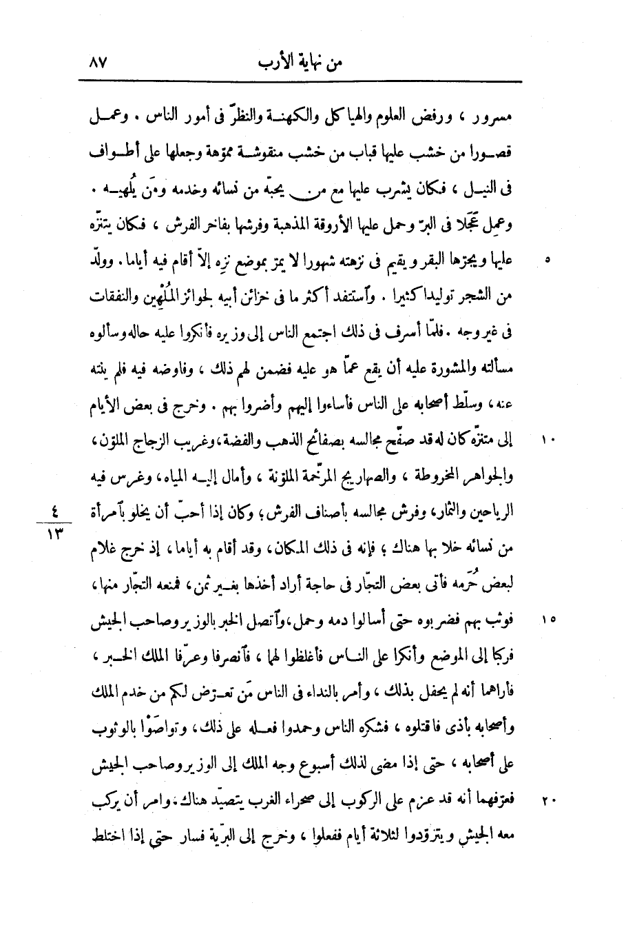 وعمل عجلا فى البرّ وحمل عليها الأروقة المذهبة وفرشها بفاخر الفرش، فكان يتنزّه عليها ويجرّها البقر ويقيم فى نزهته شهورا لا يمرّ بموضع نزه إلّا أقام فيه أياما. وولّد من الشجر توليدا كثيرا. واستتفد أكثر ما فى خزائن أبيه لجوائز الملهين والنفقات فى غير وجه. فلمّا أسرف فى ذلك اجتمع الناس إلى وزيره فأنكروا عليه حاله وسألوه مسألته والمشورة عليه أن يقع عمّا هو عليه فضمن لهم ذلك، وفاوضه فيه فلم ينته عنه، وسلّط أصحابه على الناس فأساءوا إليهم وأضروا بهم. وخرج فى بعض الأيام إلى متنزّه كان له قد صفّح مجالسه بصفائح الذهب والفضة، وغريب الزجاج الملوّن، والجواهر المخروطة، والصهاريج المرّخمة الملوّنة، وأمال إليه المياه، وغرس فيه الرياحين والثمار، وفرش مجالسه بأصناف الفرش؛ وكان إذا أحبّ أن يخلو بامرأة من نسائه خلابها هناك؛ فإنه فى ذلك المكان، وقد أقام به أياما، إذ خرج غلام لبعض حرمه فأتى بعض التجّار فى حاجة أراد أخذها بغير ثمن، فمنعه التجّار منها، فوثب بهم فضربوه حتى أسالوا دمه وحمل، واتصل الخبر بالوزير وصاحب الجيش فركبا إلى الموضع وأنكرا على الناس فأغلظوا لهما، فانصرفا وعرّفا الملك الخبر، فأراهما أنه لم يحفل بذلك، وأمر بالنداء فى الناس من تعرّض لكم من خدم الملك وأصحابه بأذى فاقتلوه، فشكره الناس وحمدوا فعله على ذلك، وتواصوا بالوثوب على أصحابه، حتى إذا مضى لذلك أسبوع وجه الملك إلى الوزير وصاحب الجيش فعرّفهما أنه قد عزم على الركوب إلى صحراء الغرب يتصيّد هناك، وامر أن يركب معه الجيش ويتزوّدوا لثلاثة أيام ففعلوا، وخرج إلى البرّية فسار حتى إذا اختلط
