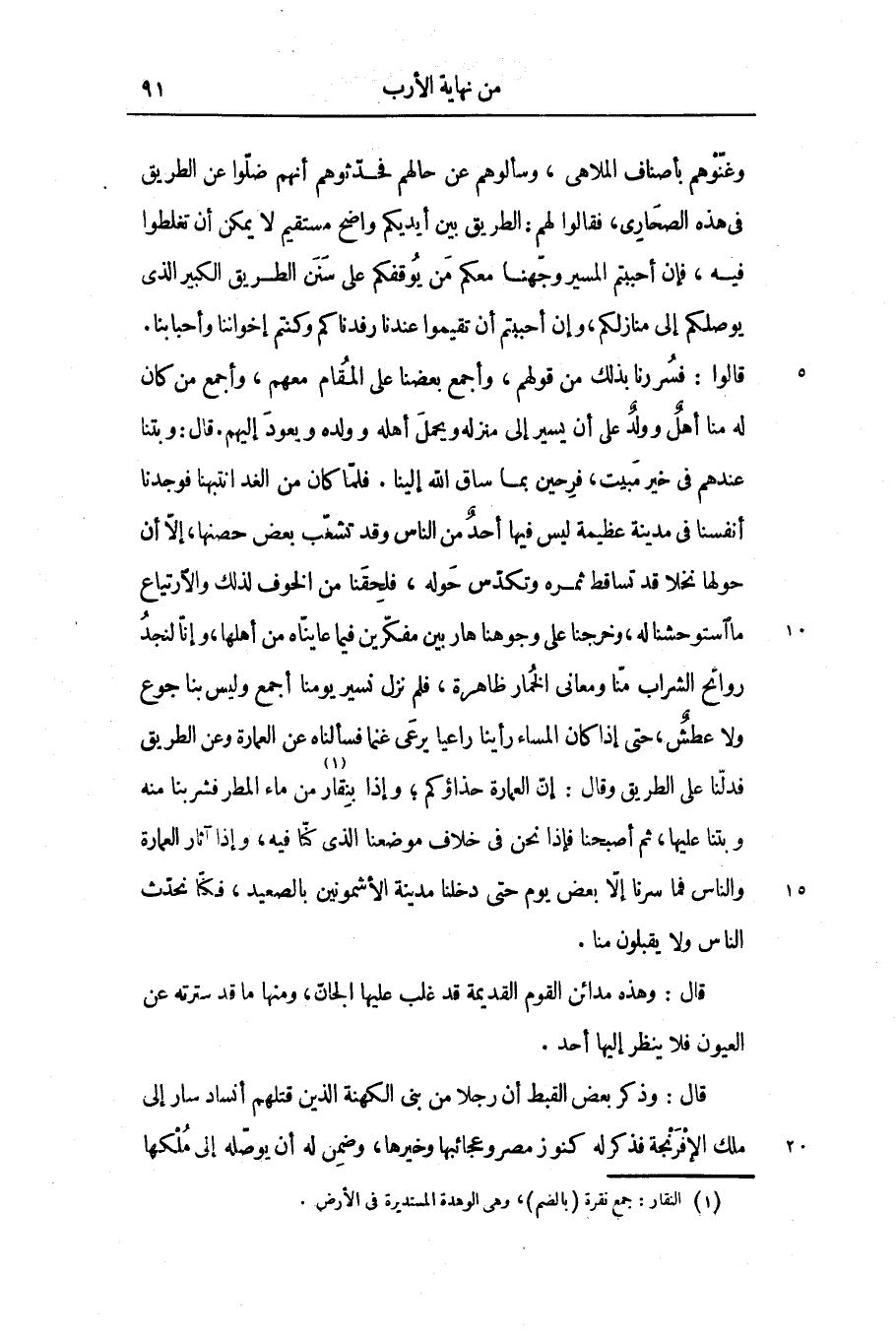 قالوا: فسررنا بذلك من قولهم، وأجمع بعضنا على المقام معهم، وأجمع من كان له منا أهل وولد على أن يسير إلى منزله ويحمل أهله وولده ويعود إليهم. قال: وبتنا عندهم فى خير مبيت، فرحين بما ساق الله إلينا. فلمّا كان من الغد انتبهنا فوجدنا أنفسنا فى مدينة عظيمة ليس فيها أحد من الناس وقد تشعّب بعض حصنها، إلّا أن حولها نخلا قد تساقط ثمره وتكدّس حوله، فلحقنا من الخوف لذلك والارتياع ما استوحشنا له، وخرجنا على وجوهنا هاربين مفكّرين فيما عاينّاه من أهلها، وإنّا لنجد روائح الشراب منّا ومعانى الخمار ظاهرة، فلم نزل نسير يومنا أجمع وليس بنا جوع ولا عطش، حتى إذا كان المساء رأينا راعيا يرعى غنما فسألناه عن العمارة وعن الطريق فدلّنا على الطريق وقال: إنّ العمارة حذاؤكم؛ وإذا بنقار «1» من ماء المطر فشربنا منه وبتنا عليها، ثم أصبحنا فإذا نحن فى خلاف موضعنا الذى كنّا فيه، وإذا آثار العمارة والناس فما سرنا إلّا بعض يوم حتى دخلنا مدينة الأشمونين بالصعيد، فكنّا نحدّث الناس ولا يقبلون منا.
