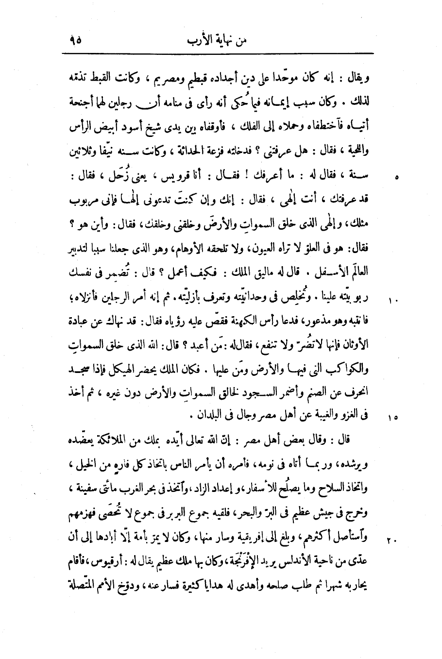 قال: وقال بعض أهل مصر: إنّ الله تعالى أيّده بملك من الملائكة يعضّده ويرشده، وربما أتاه فى نومه، فأمره أن يأمر الناس باتخاذ كل فاره من الخيل، واتخاذ السلاح وما يصلح للأسفار، وإعداد الزاد، واتخذ فى بحر الغرب مائتى سفينة، وخرج فى جيش عظيم فى البرّ والبحر، فلقيه جموع البربر فى جموع لا تحصى فهزمهم واستأصل أكثرهم، وبلغ إلى إفريقية وسار منها، وكان لا يمرّ بأمة إلّا أبادها إلى أن عدّى من ناحية الأندلس يريد الإفرنجة، وكان بها ملك عظيم يقال له: أرقيوس، فأقام يحاربه شهرا ثم طلب صلحه وأهدى له هدايا كثيرة فسار عنه، ودوّخ الأمم المتّصلة
