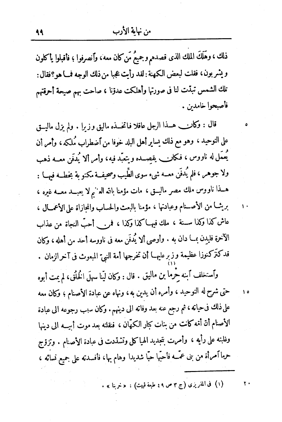 قال: وكان هذا الرجل عاقلا فاتخذه ماليق وزيرا. ولم يزل ماليق على التوحيد، وهو مع ذلك يساير أهل البلد خوفا من اضطراب ملكه، وأمر أن يعمل له ناووس، فكان يقصده ويتعبّد فيه، وأمر ألا يدفن معه ذهب ولا جوهر، فلم يدفن معه شىء سوى الطّيب وصحيفة مكتوبة بخطه فيها: