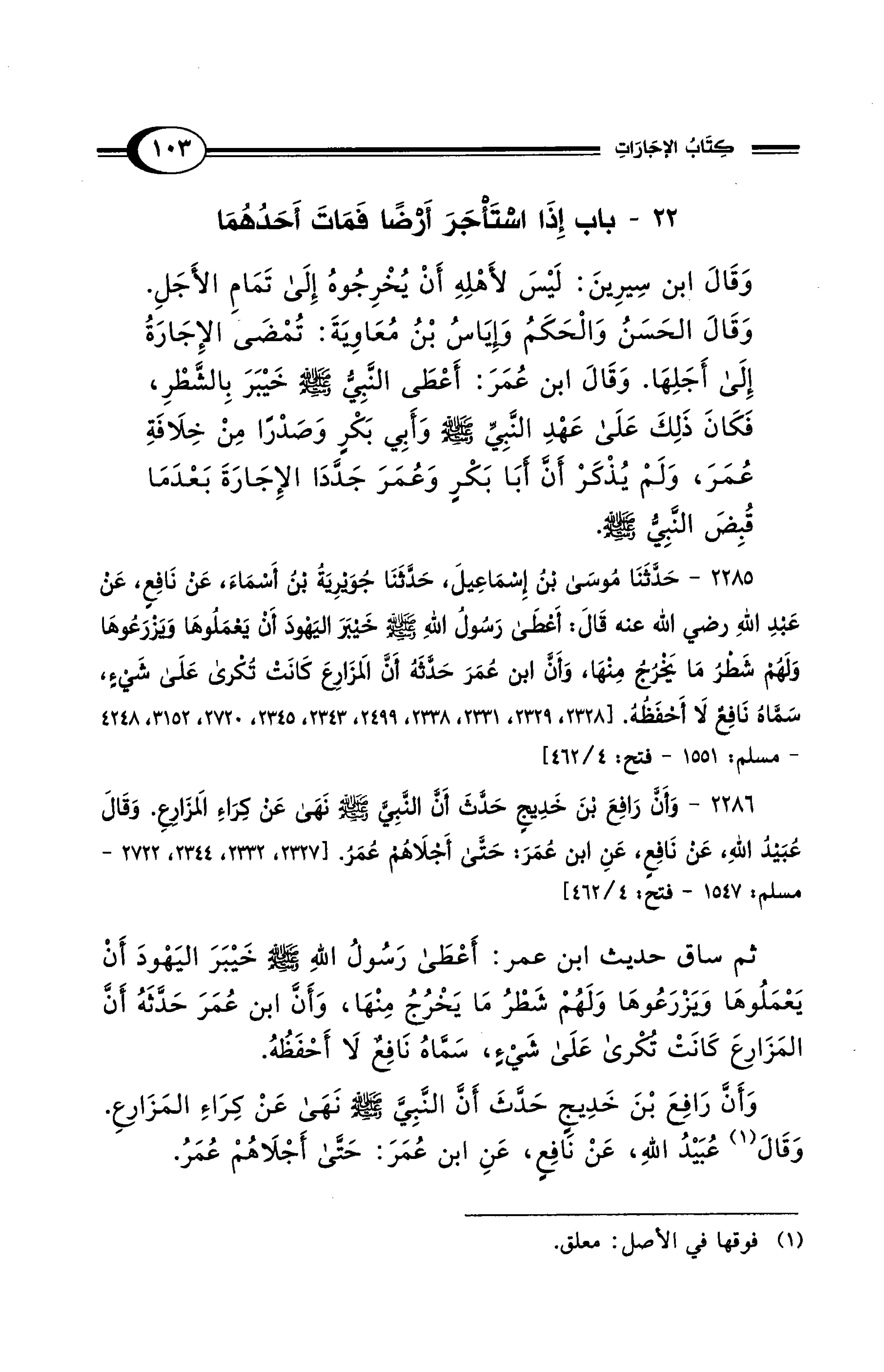 ثم ساق حديث ابن عمر: أَعْطَى رَسُولُ الله - صلى الله عليه وسلم - خَيْبَرَ اليَهْودَ أَنْ يَعْمَلُوهَا وَيزْرَعُوهَا وَلَهُمْ شَطْرُ مَا يَخْرُجُ مِنْهَا، وَأَنَّ ابن عُمَرَ حَدَّثَهُ أَنَّ المَزَارعَ كَانَتْ تُكْرى عَلَى شَيءٍ، سماهُ نَافِعٌ لَا أَحْفَظُهُ.