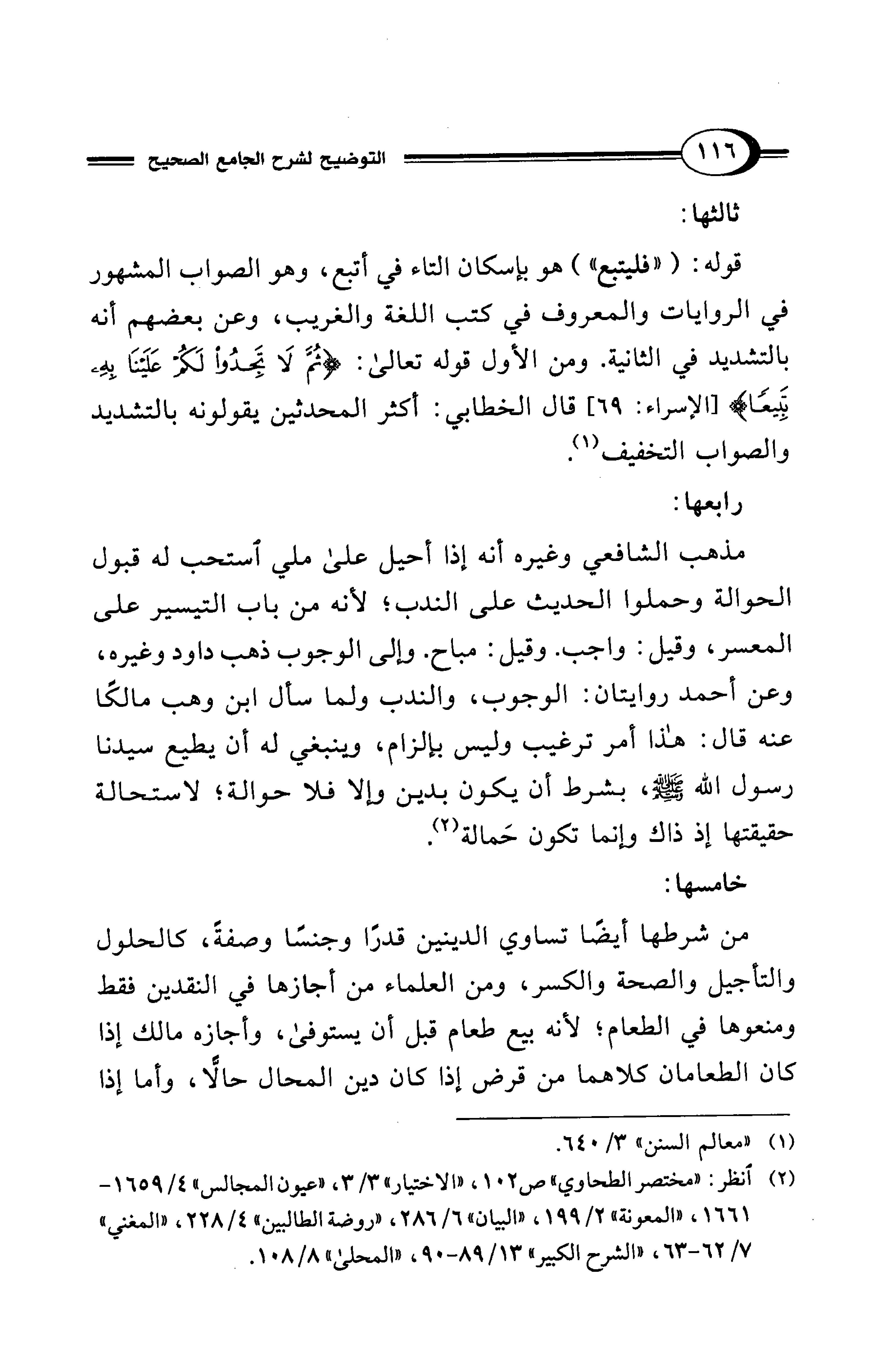 مذهب الشافعي وغيره أنه إذا أحيل على ملي استحب له قبول الحوالة وحملوا الحديث على الندب؛ لأنه من باب التيسير على المعسر، وقيل: واجب. وقيل: مباح. وإلى الوجوب ذهب داود وغيره، وعن أحمد روايتان: الوجوب، والندب ولما سأل ابن وهب مالكًا عنه قال: هذا أمر ترغيب وليس بإلزام، وينبغي له أن يطيع سيدنا رسول الله - صلى الله عليه وسلم -، بشرط أن يكون بدين وإلا فلا حوالة؛ لاستحالة حقيقتها إذ ذاك وإنما تكون حَمالة (¬2).