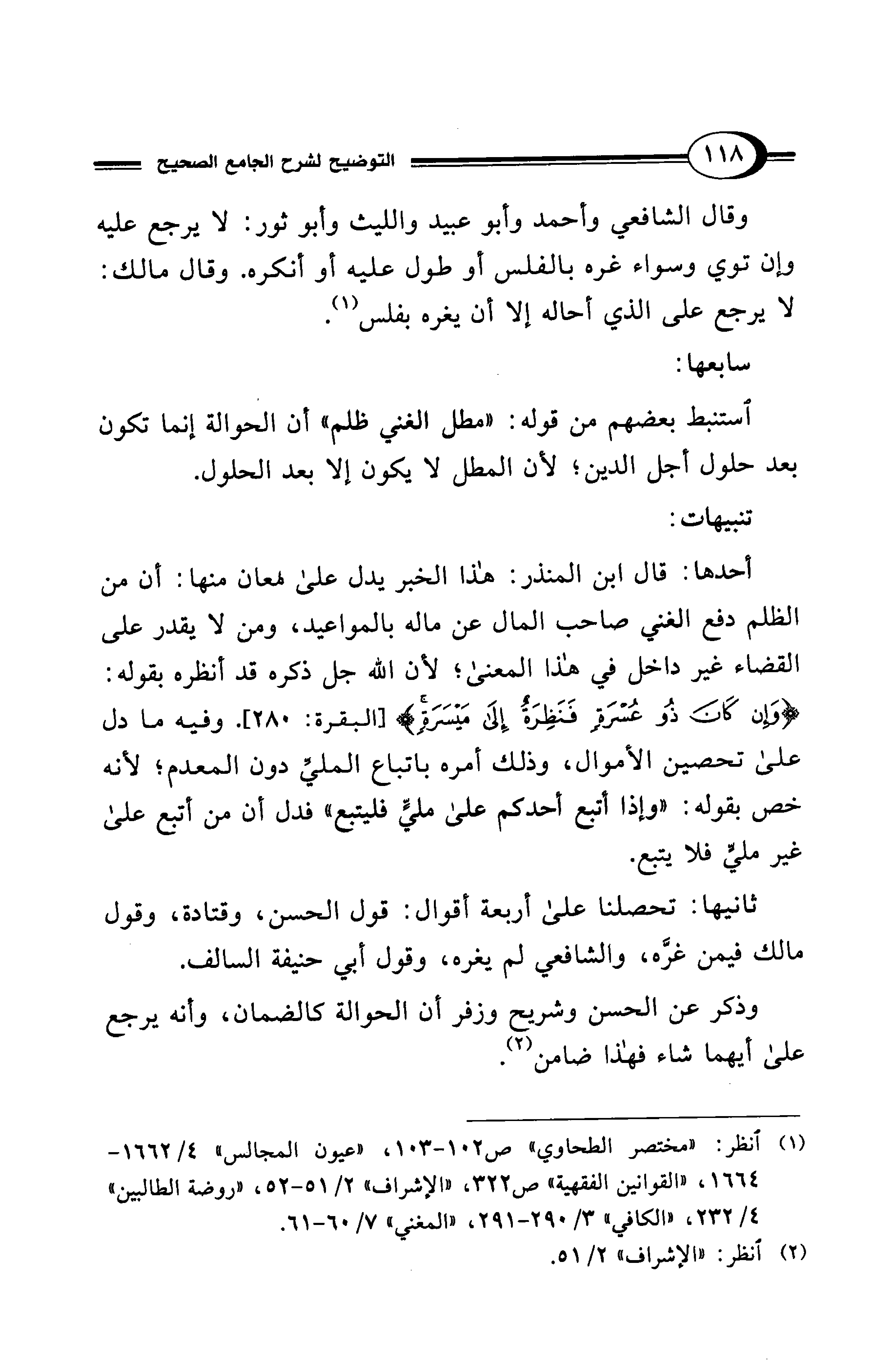 أحدها: قال ابن المنذر: هذا الخبر يدل على معان منها: أن من الظلم دفع الغني صاحب المال عن ماله بالمواعيد، ومن لا يقدر على القضاء غير داخل في هذا المعنى؛ لأن الله جل ذكره قد أنظره بقوله: {وَإِنْ كَانَ ذُو عُسْرَةٍ فَنَظِرَةٌ إِلَى مَيْسَرَةٍ} [البقرة: 280]. وفيه ما دل على تحصين الأموال، وذلك أمره باتباع المليِّ دون المعدم؛ لأنه خص بقوله: "وإذا أتبع أحدكم على مليٍّ فليتبع" فدل أن من أتبع على غير مليٍّ فلا يتبع.