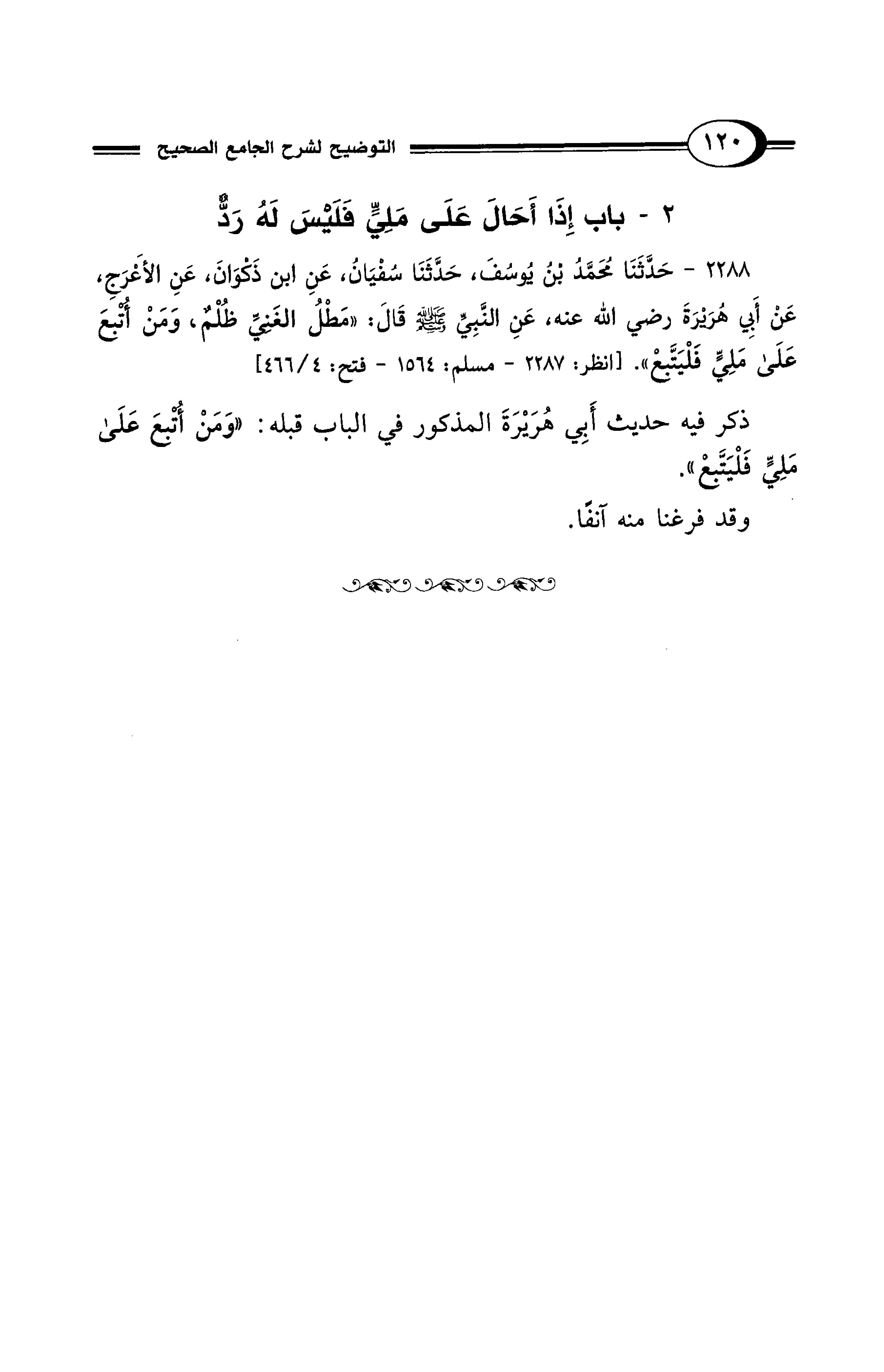 2288 - حَدَّثَنَا مُحَمَّدُ بْنُ يُوسُفَ، حَدَّثَنَا سُفْيَانُ، عَنِ ابْنِ ذَكْوَانَ، عَنِ الأَعْرَجِ، عَنْ أَبِي هُرَيْرَةَ رضي الله عنه، عَنِ النَّبِيِّ - صلى الله عليه وسلم - قَالَ: "مَطْلُ الغَنِيِّ ظُلْمٌ، وَمَنْ أُتْبِعَ عَلَى مَلِيٍّ فَلْيَتَّبِعْ". [انظر: 2287 - مسلم: 1564 - فتح: 4/ 466]