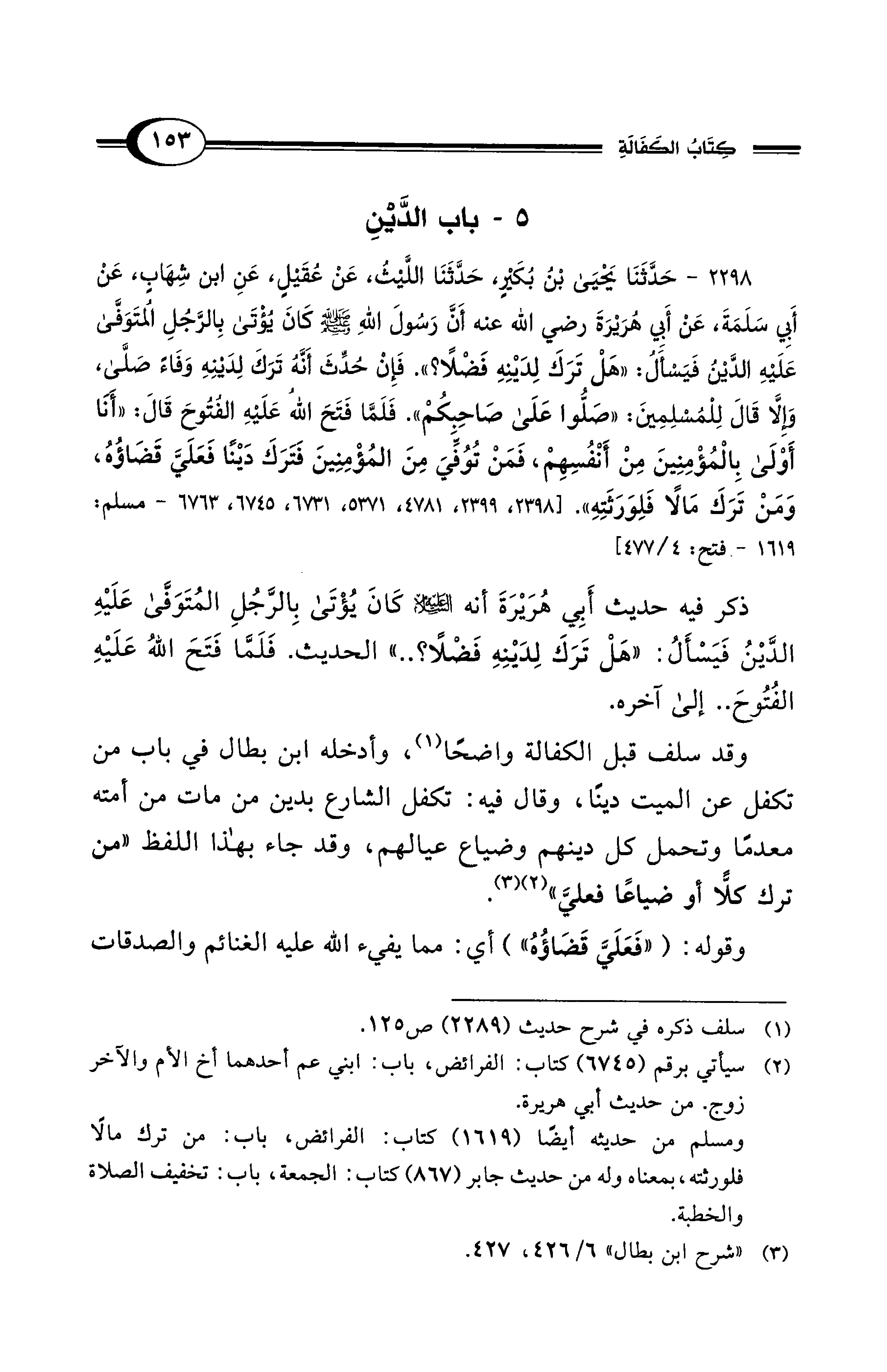 ذكر فيه حديث أَبِي هريرَةَ أنه - عليه السلام - كَانَ يُؤْتَى بِالرَّجُلِ المُتَوَفَّى عَلَيْهِ الدَّيْنُ فَيَسْأَلُ: "هَلْ تَرَكَ لِدَيْنِهِ فَضْلًا؟ .. " الحديث. فَلَمَّا فَتَحَ اللهُ عَلَيْهِ الفُتُوحَ .. إلى آخره.
