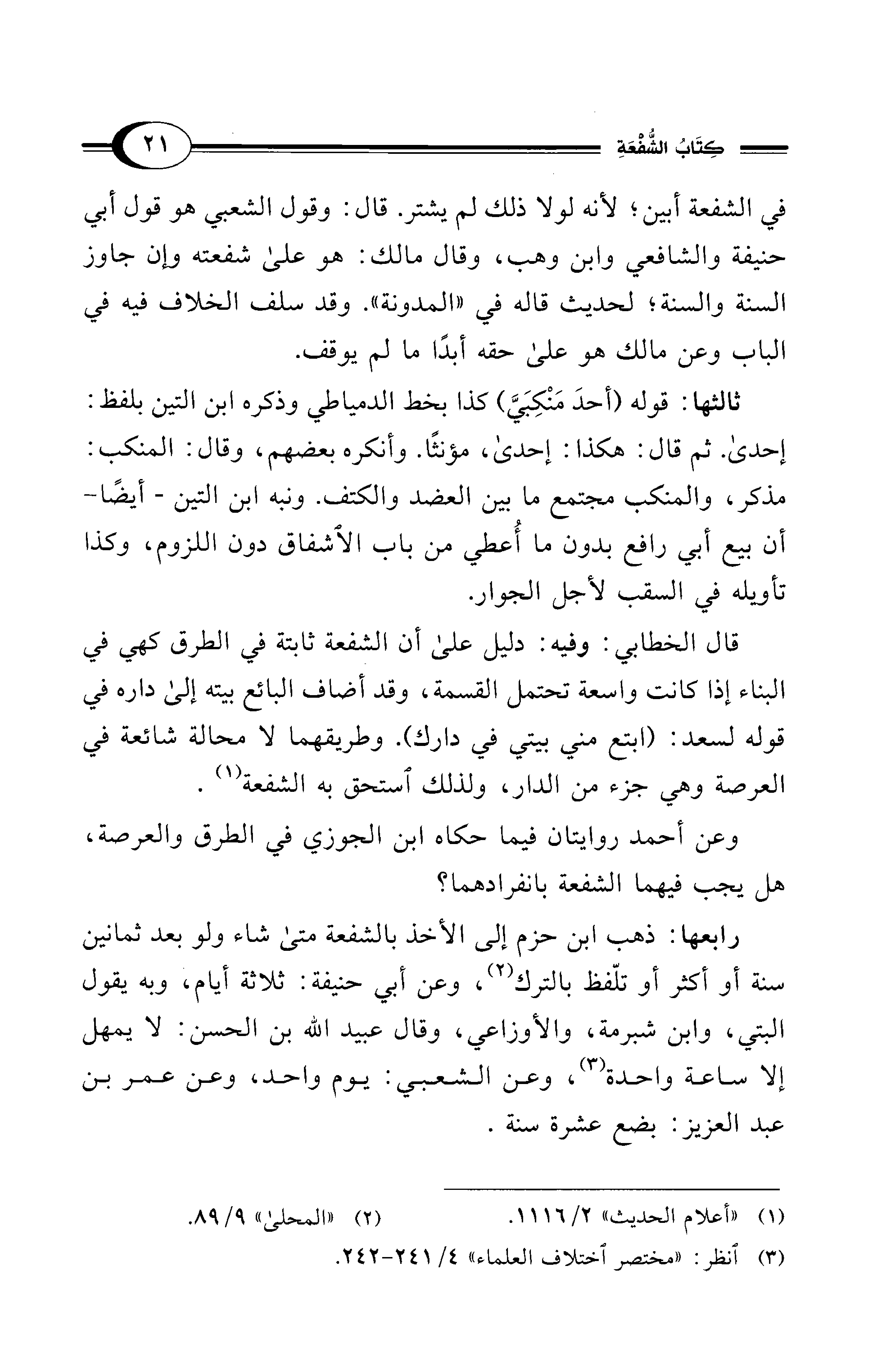 رابعها: ذهب ابن حزم إلى الأخذ بالشفعة متى شاء ولو بعد ثمانين سنة أو أكثر أو تلّفظ بالترك (¬2)، وعن أبي حنيفة: ثلاثة أيام، وبه يقول البتي، وابن شبرمة، والأوزاعي، وقال عبيد الله بن الحسن: لا يمهل إلا ساعة واحدة (¬3)، وعن الشعبي: يوم واحد، وعن عمر بن عبد العزيز: بضع عشرة سنة.