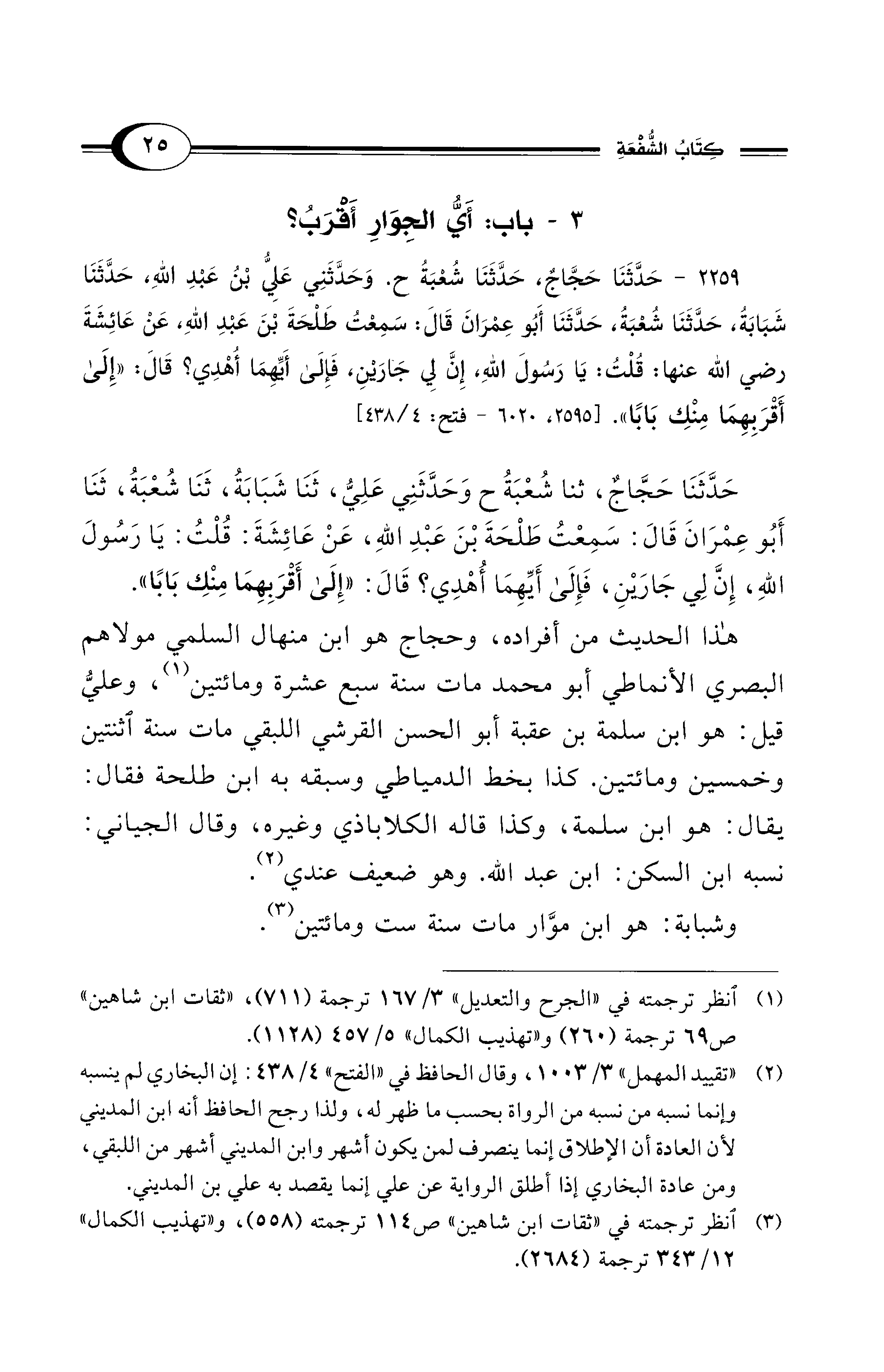 2259 - حَدَّثَنَا حَجَّاجٌ، حَدَّثَنَا شُعْبَةُ ح. وَحَدَّثَنِي عَلِيُّ بْنُ عَبْدِ اللهِ، حَدَّثَنَا شَبَابَةُ، حَدَّثَنَا شُعْبَةُ، حَدَّثَنَا أَبُو عِمْرَانَ قَالَ: سَمِعْتُ طَلْحَةَ بْنَ عَبْدِ اللهِ، عَنْ عَائِشَةَ رضى الله عنها: قُلْتُ يَا رَسُولَ اللهِ، إِنَّ لِي جَارَيْنِ، فَإِلَى أَيِّهِمَا أُهْدِي؟ قَالَ: "إِلَى أَقْرَبِهِمَا مِنْكِ بَابًا". [2595، 6020 - فتح: 4/ 438]