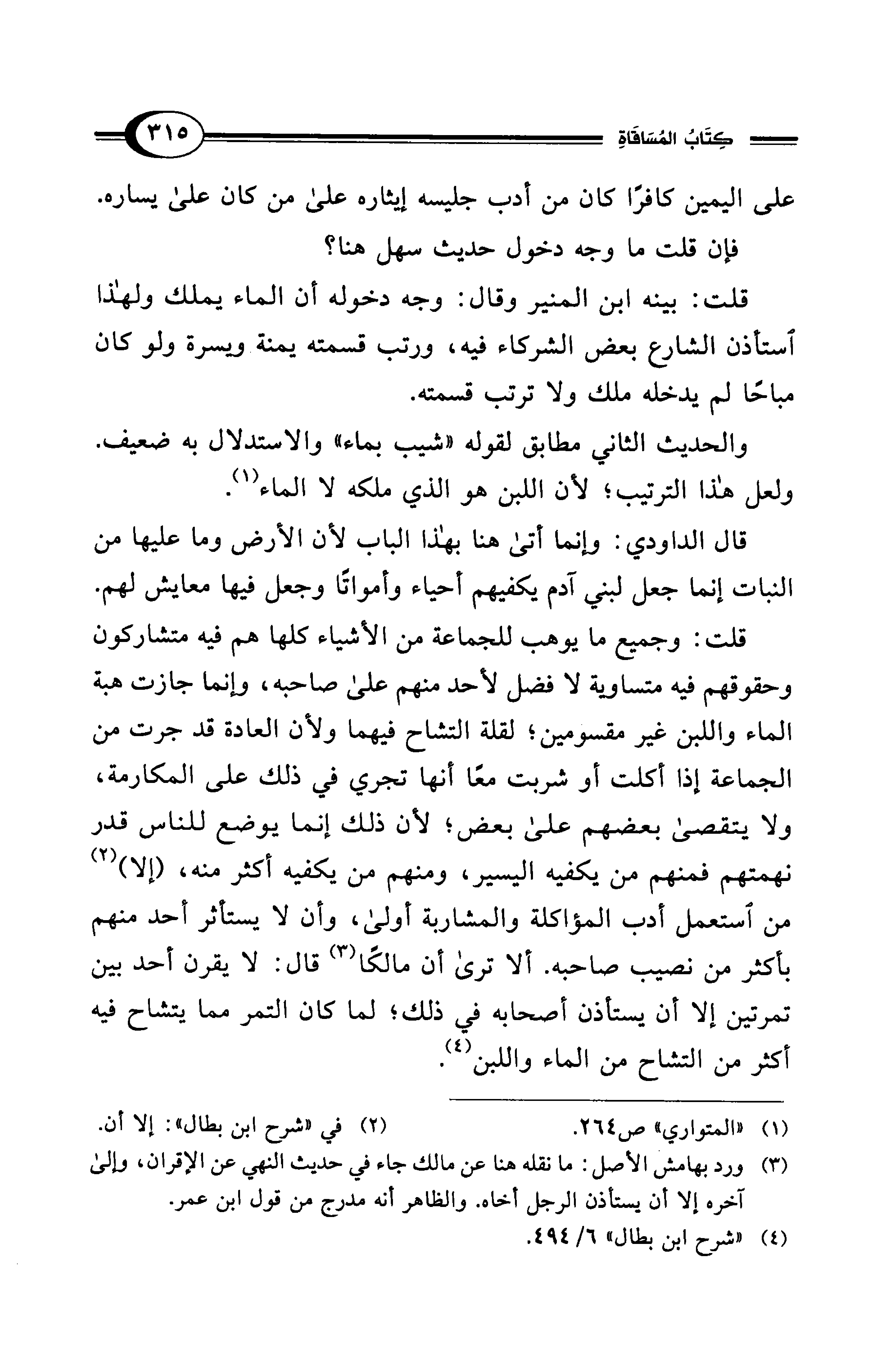 قلت: وجميع ما يوهب للجماعة من الأشياء كلها هم فيه متشاركون وحقوقهم فيه متساوية لا فضل لأحد منهم على صاحبه، وإنما جازت هبة الماء واللبن غير مقسومين؛ لقلة التشاح فيهما ولأن العادة قد جرت من الجماعة إذا أكلت أو شربت معًا أنها تجري في ذلك على المكارمة، ولا يتقصى بعضهم على بعض؛ لأن ذلك إنما يوضع للناس قدر نهمتهم فمنهم من يكفيه اليسير، ومنهم من يكفيه أكثر منه، (إلا) (¬2) من استعمل أدب المؤاكلة والمشاربة أولى، وأن لا يستأثر أحد منهم بأكثر من نصيب صاحبه. ألا ترى أن مالكًا (¬3) قال: لا يقرن أحد بين تمرتين إلا أن يستأذن أصحابه في ذلك؛ لما كان التمر مما يتشاح فيه أكثر من التشاح من الماء واللبن (¬4).