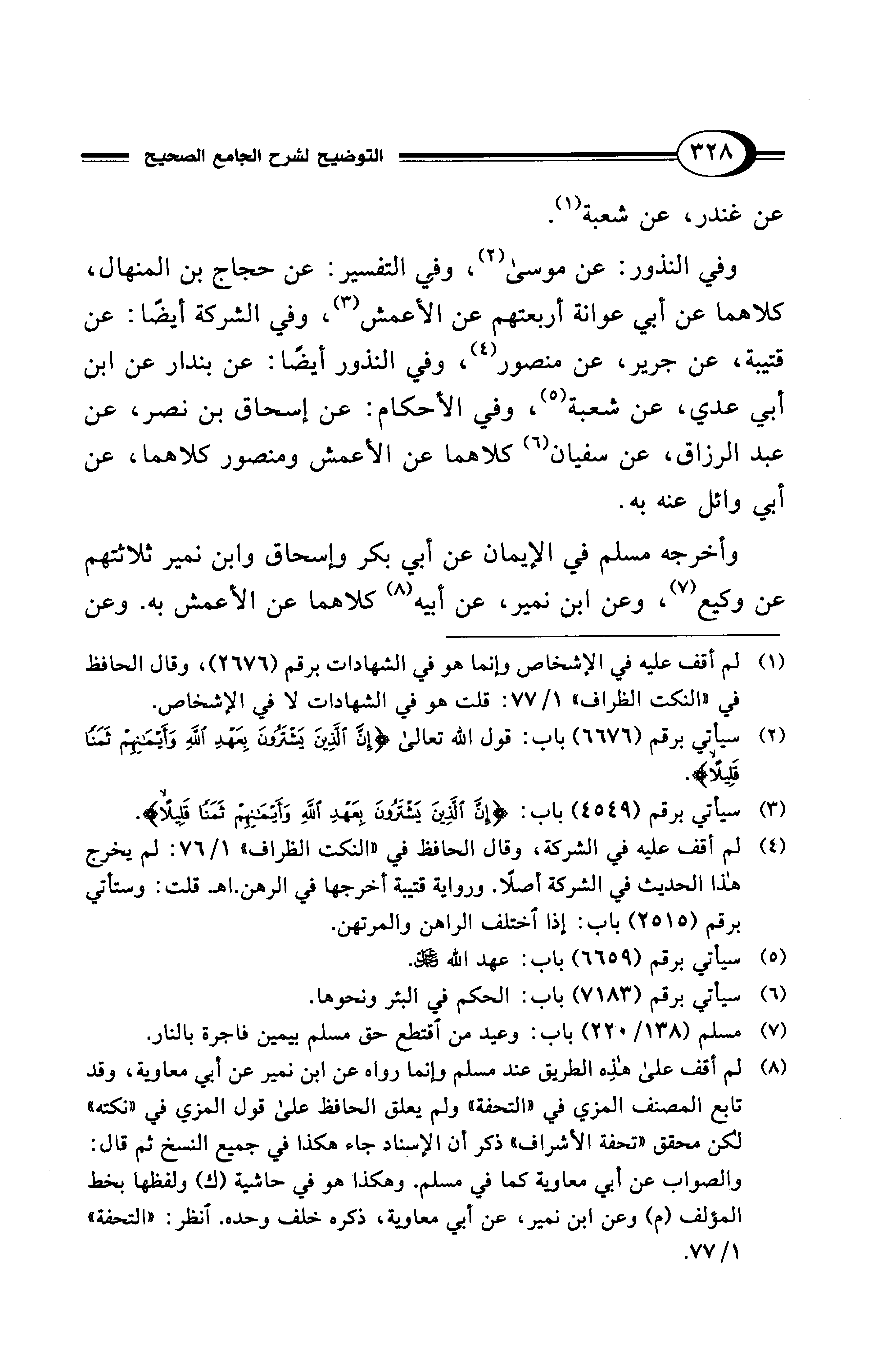 وفي النذور: عن موسى (¬2)، وفي التفسير: عن حجاج بن المنهال، كلاهما عن أبي عوانة أربعتهم عن الأعمش (¬3)، وفي الشركة أيضًا: عن قتيبة، عن جرير، عن منصور (¬4)، وفي النذور أيضًا: عن بندار عن ابن أبي عدي، عن شعبة (¬5)، وفي الأحكام: عن إسحاق بن نصر، عن عبد الرزاق، عن سفيان (¬6) كلاهما عن الأعمش ومنصور كلاهما، عن أبي وائل عنه به.