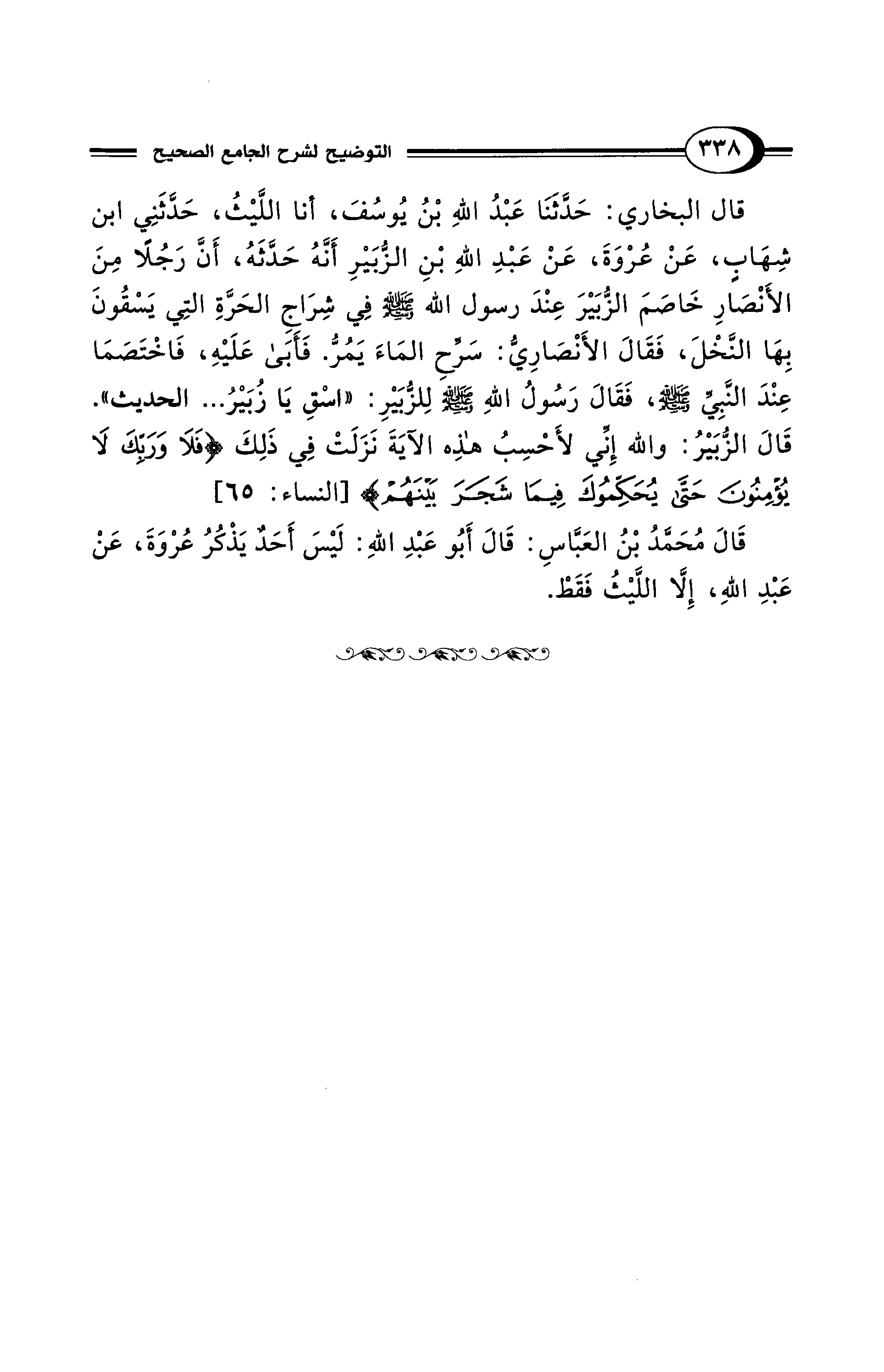 قال البخاري: حَدَّثَنَا عَبْدُ اللهِ بْنُ يُوسُفَ، أنا اللَّيْثُ، حَدَّثَنِي ابن شِهَابٍ، عَنْ عُرْوَةَ، عَنْ عَبْدِ اللهِ بْنِ الزُّبَيْرِ أَنَّهُ حَدَّثَهُ، أَنَّ رَجُلًا مِنَ الأَنْصَارِ خَاصَمَ الزُّبَيْرَ عِنْدَ رسول الله - صلى الله عليه وسلم - فِي شِرَاجِ الحَرَّةِ التِي يَسْقُونَ بِهَا النَّخْلَ، فَقَالَ الأَنْصَارِيُّ: سَرِّحِ المَاءَ يَمُرُّ. فَأَبَى عَلَيْهِ، فَاخْتَصَمَا عِنْدَ النَّبِيِّ - صلى الله عليه وسلم -، فَقَالَ رَسُولُ اللهِ لِلزُّبَيْرِ: "اسْقِ يَا زُبَيْرُ ... الحديث". قَالَ الزُّبَيْرُ: والله إِنِّي لأَحْسِبُ هذِه الآيةَ نَزَلَتْ فِي ذَلِكَ {فَلَا وَرَبِّكَ لَا يُؤْمِنُونَ حَتَّى يُحَكِّمُوكَ فِيمَا شَجَرَ بَيْنَهُمْ} [النساء: 65]