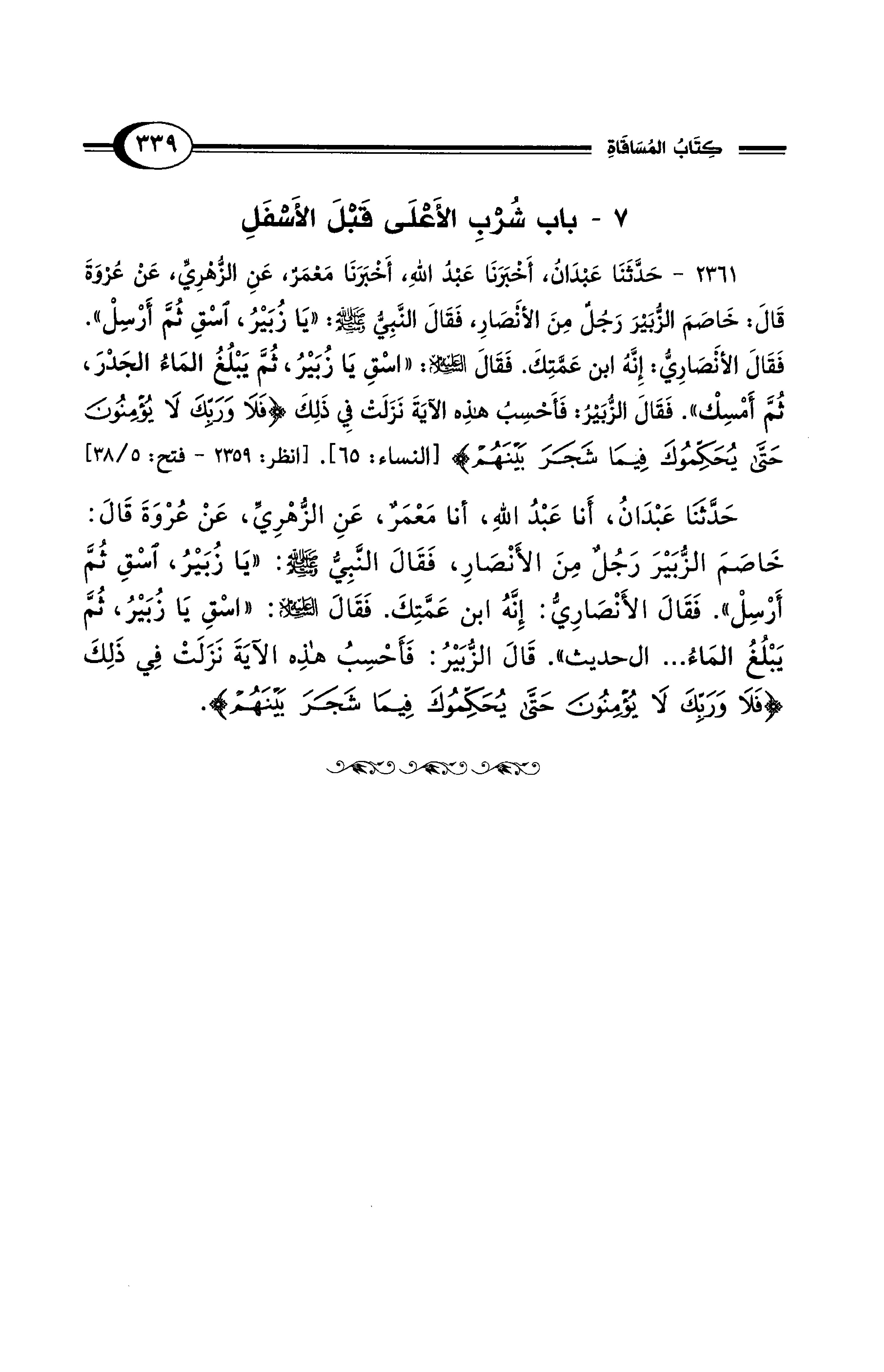 2361 - حَدَّثَنَا عَبْدَانُ، أَخْبَرَنَا عَبْدُ اللهِ، أَخْبَرَنَا مَعْمَرٌ، عَنِ الزُّهْرِيِّ عَنْ عُرْوَةَ قَالَ: خَاصَمَ الزُّبَيْرَ رَجُلٌ مِنَ الأَنْصَارِ، فَقَالَ النَّبِيُّ - صلى الله عليه وسلم -: "يَا زُبَيْرُ، اسْقِ ثُمَّ أَرْسِلْ". فَقَالَ الأَنْصَارِيُّ: إِنَّهُ ابْنُ عَمَّتِكَ. فَقَالَ - عليه السلام -: "اسْقِ يَا زُبَيْرُ، ثُمَّ يَبْلُغُ المَاءُ الجَدْرَ، ثُمَّ أَمْسِكْ". فَقَالَ الزُّبَيْرُ: فَأَحْسِبُ هَذِهِ الآيَةَ نَزَلَتْ فِي ذَلِكَ {فَلاَ وَرَبِّكَ لَا يُؤْمِنُونَ حَتَّى يُحَكِّمُوكَ فِيمَا شَجَرَ بَيْنَهُمْ} [النساء: 65]. [انظر: 2359 - فتح: 5/ 38]