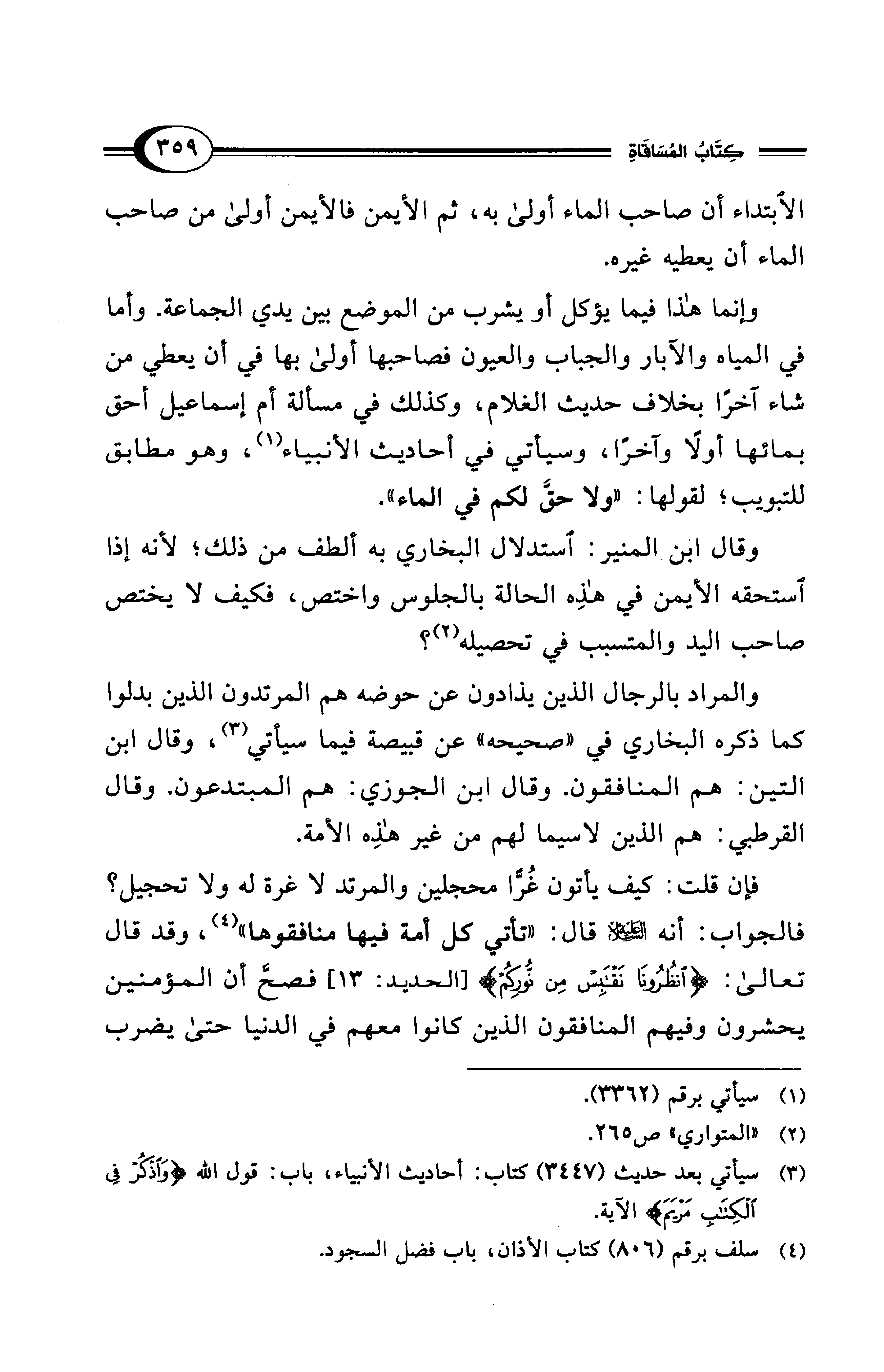 الابتداء أن صاحب الماء أولى به، ثم الأيمن فالأيمن أولى من صاحب الماء أن يعطيه غيره.