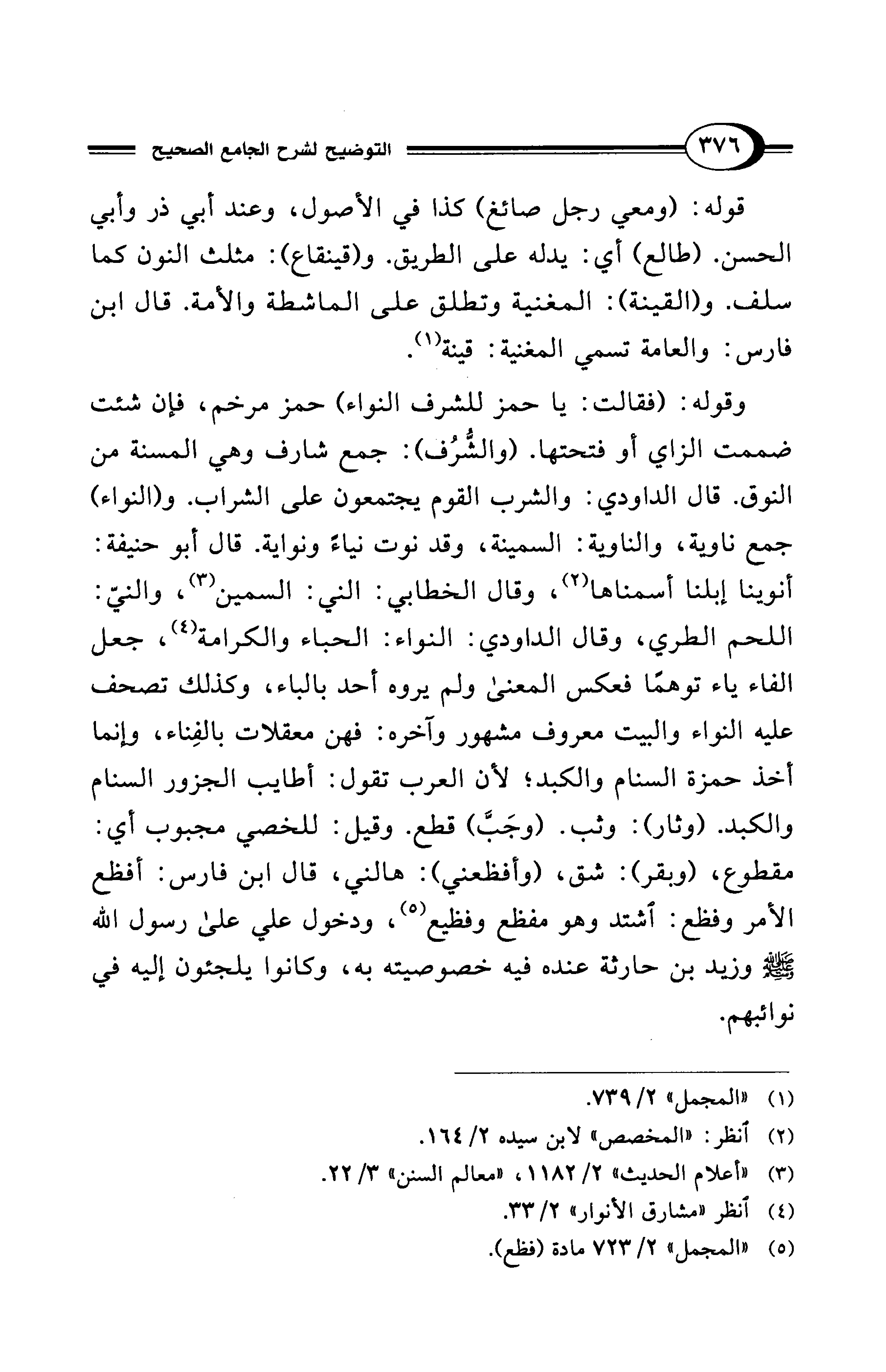 وقوله: (فقالت: يا حمز للشرف النواء) حمز مرخم، فإن شئت ضممت الزاي أو فتحتها. (والشُّرُف): جمع شارف وهي المسنة من النوق. قال الداودي: والشرب القوم يجتمعون على الشراب. و (النواء) جمع ناوية، والناوية: السمينة، وقد نوت نياءً ونواية. قال أبو حنيفة: أنوينا إبلنا أسمناها (¬2)، وقال الخطابي: الني: السمين (¬3)، والنيّ: اللحم الطري، وقال الداودي: النواء: الحباء والكرامة (¬4)، جعل الفاء ياء توهمًا فعكس المعنى ولم يروه أحد بالباء، وكذلك تصحف عليه النواء والبيت معروف مشهور وآخره: فهن معقلات بالفِناء، وإنما أخذ حمزة السنام والكبد؛ لأن العرب تقول: أطايب الجزور السنام والكبد. (وثار): وثب. (وجَبَّ) قطع. وقيل: للخصي مجبوب أي: مقطوع، (وبقر): شق، (وأفظعني): هالني، قال ابن فارس: أفظع الأمر وفظع: اشتد وهو مفظع وفظيع (¬5)، ودخول علي على رسول الله - صلى الله عليه وسلم - وزيد بن حارثة عنده فيه خصوصيته به، وكانوا يلجئون إليه في نوائبهم.