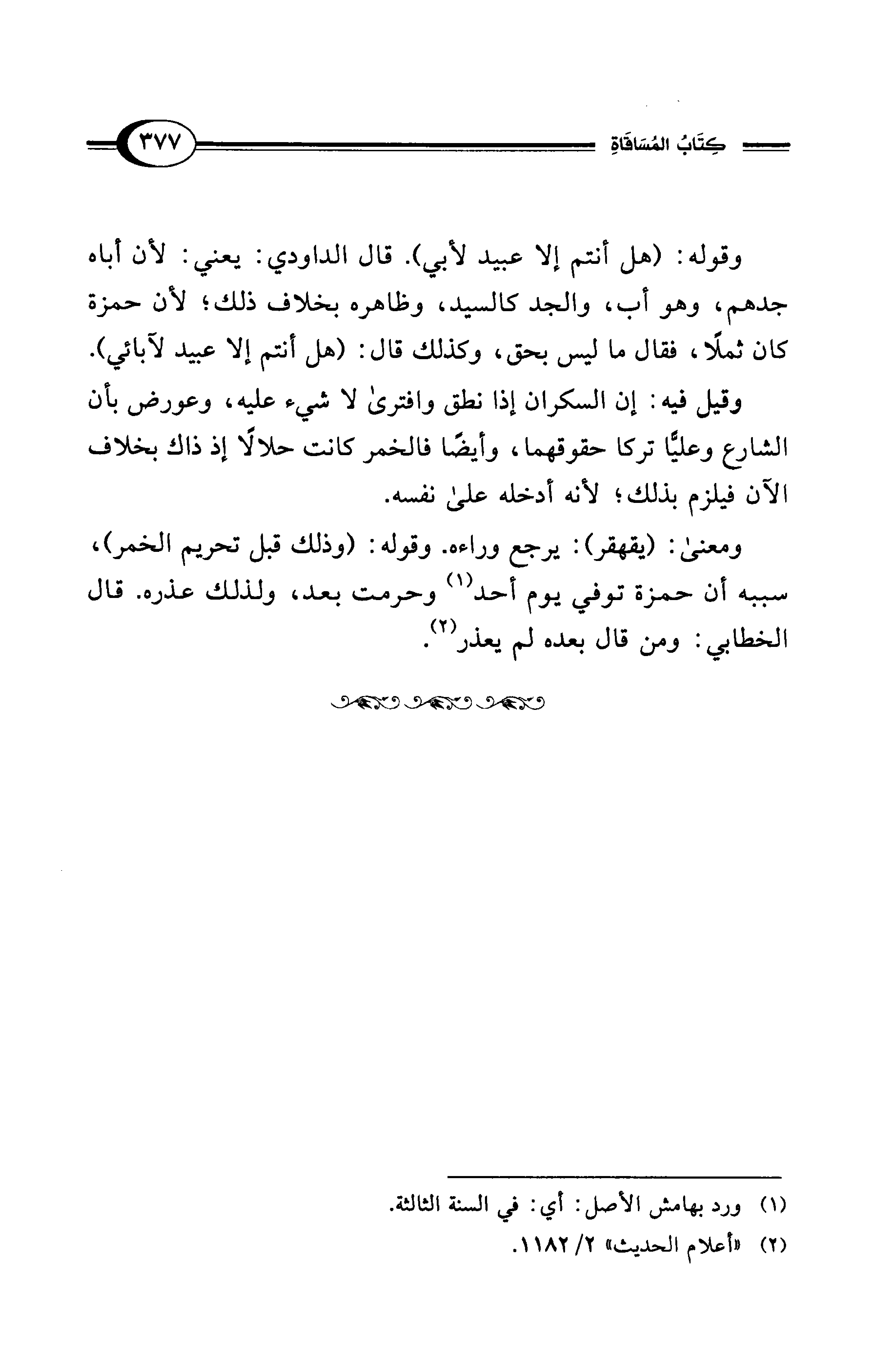 وقوله: (هل أنتم إلا عبيد لأبي). قال الداودي: يعني: لأن أباه جدهم، وهو أب، والجد كالسيد، وظاهره بخلاف ذلك؛ لأن حمزة كان ثملًا، فقال ما ليس بحق، وكذلك قال: (هل أنتم إلا عبيد لآبائي).