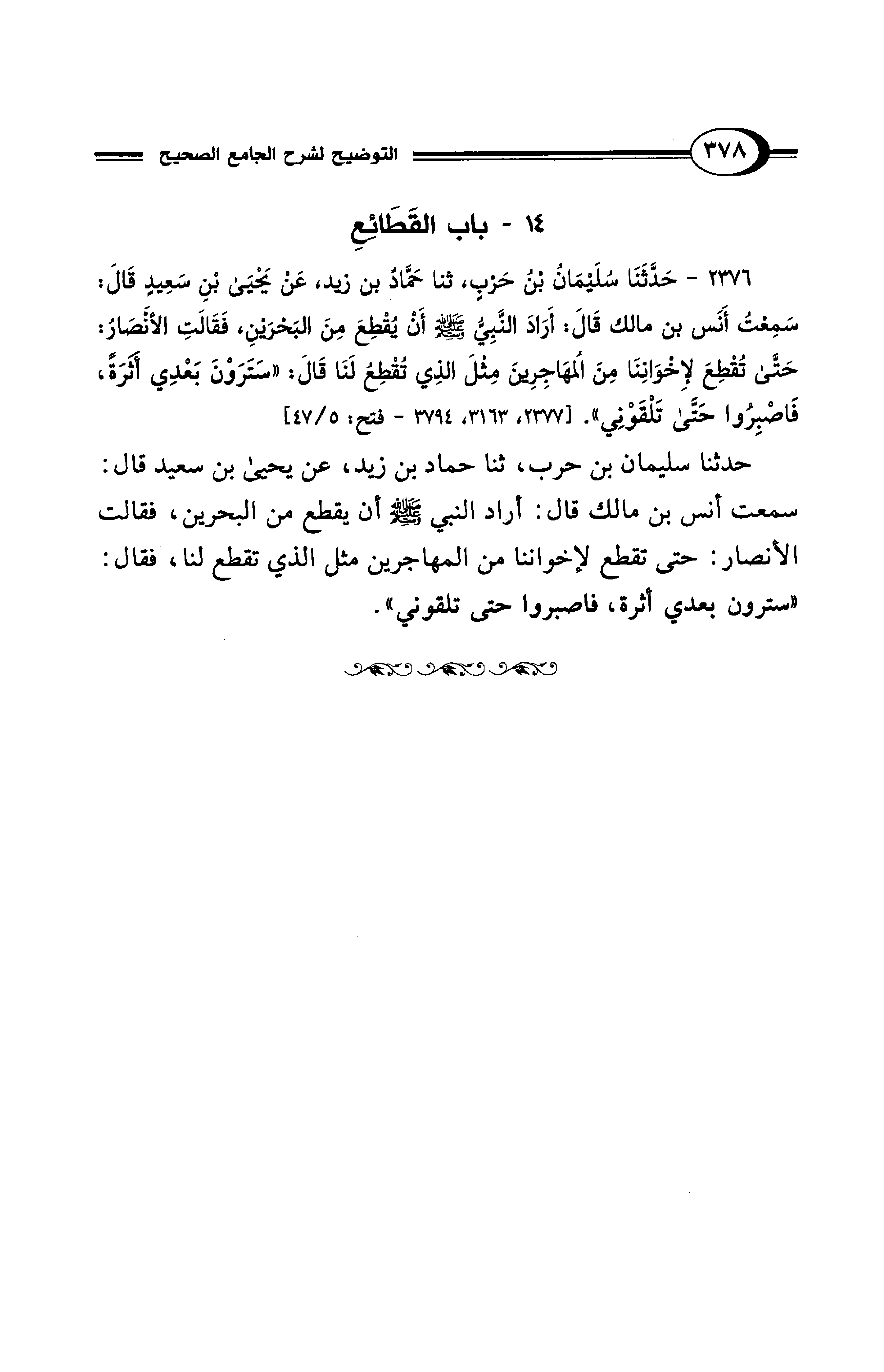 2376 - حَدَّثَنَا سُلَيْمَانُ بْنُ حَرْبٍ، حَدَّثَنَا حَمَّادٌ بن زيد، عَنْ يَحْيَى بْنِ سَعِيدٍ قَالَ: سَمِعْتُ أَنَس بن مالك قَالَ: أَرَادَ النَّبِيُّ - صلى الله عليه وسلم - أَنْ يُقْطِعَ مِنَ البَحْرَيْنِ، فَقَالَتِ الأَنْصَارُ: حَتَّى تُقْطِعَ لإِخْوَانِنَا مِنَ المُهَاجِرِينَ مِثْلَ الذِي تُقْطِعُ لَنَا قَالَ: "سَتَرَوْنَ بَعْدِي أَثَرَةً، فَاصْبِرُوا حَتَّى تَلْقَوْنِي". [2377، 3163، 3794 - فتح: 5/ 47]