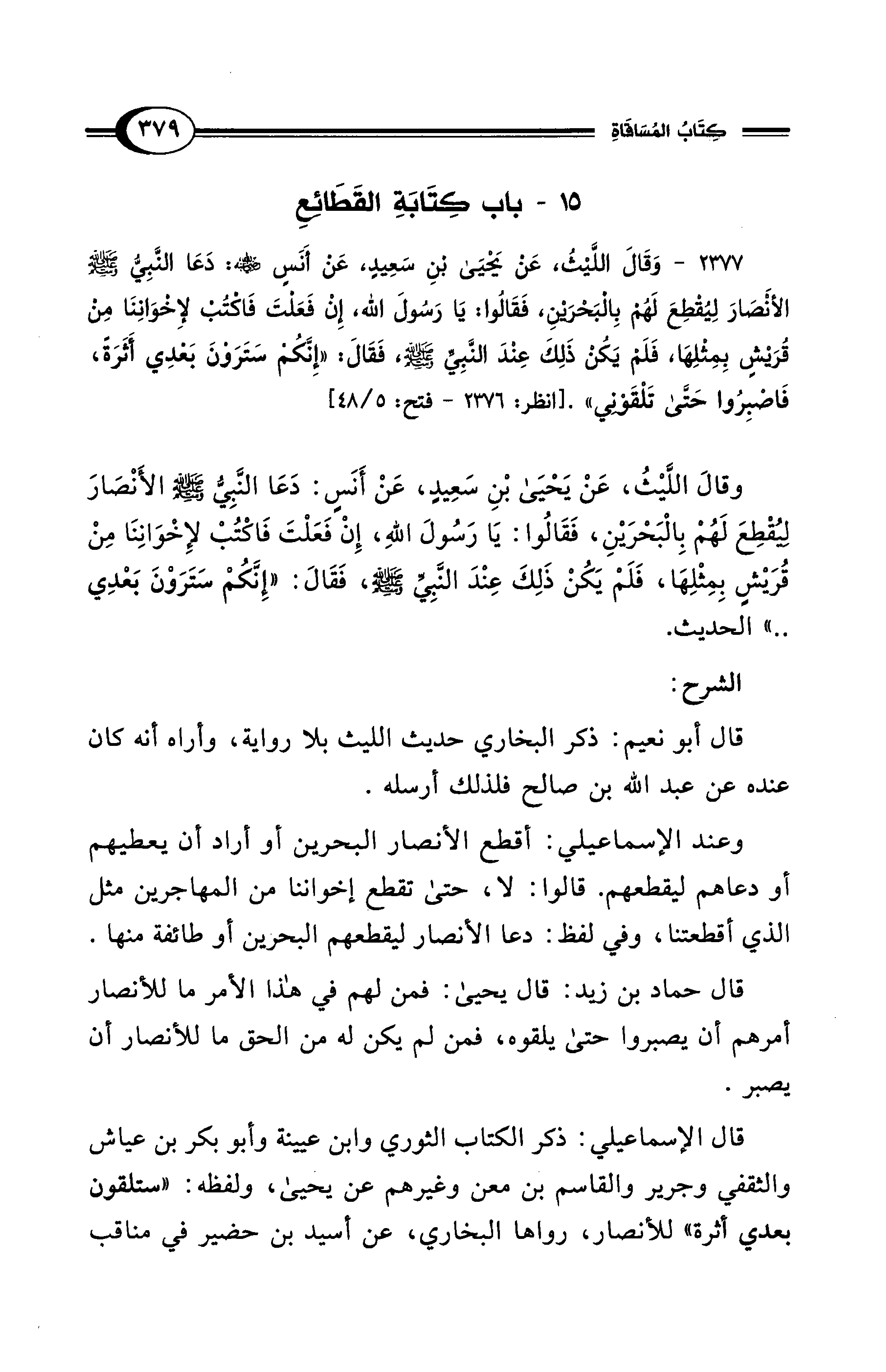 2377 - وَقَالَ اللَّيْثُ، عَنْ يَحْيَى بْنِ سَعِيدٍ، عَنْ أَنَسٍ رضى الله عنه: دَعَا النَّبِيُّ - صلى الله عليه وسلم - الأَنْصَارَ لِيُقْطِعَ لَهُمْ بِالبَحْرَيْنِ، فَقَالُوا: يَا رَسُولَ اللهِ، إِنْ فَعَلْتَ فَاكْتُبْ لإِخْوَانِنَا مِنْ قُرَيْشٍ بِمِثْلِهَا، فَلَمْ يَكُنْ ذَلِكَ عِنْدَ النَّبِيِّ - صلى الله عليه وسلم - فَقَالَ: "إِنَّكُمْ سَتَرَوْنَ بَعْدِي أَثَرَةً، فَاصْبِرُوا حَتَّى تَلْقَوْنِي". [انظر: 2376 - فتح: 5/ 48]