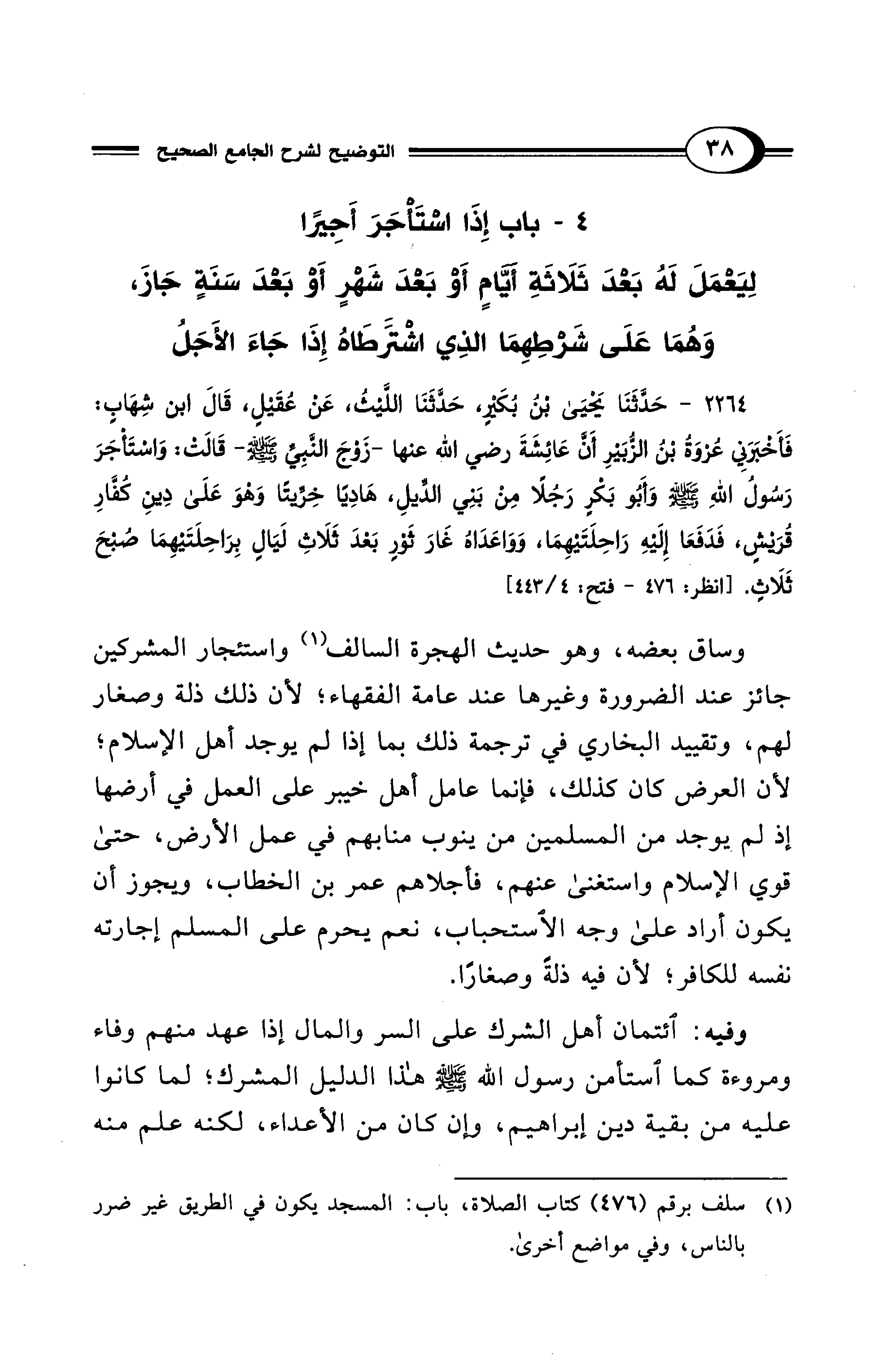 وساق بعضه، وهو حديث الهجرة السالف (¬1) واستئجار المشركين جائز عند الضرورة وغيرها عند عامة الفقهاء؛ لأن ذلك ذلة وصغار لهم، وتقييد البخاري في ترجمة ذلك بما إذا لم يوجد أهل الإسلام؛ لأن العرض كان كذلك، فإنما عامل أهل خيبر على العمل في أرضها إذ لم يوجد من المسلمين من ينوب منابهم في عمل الأرض، حتى قوي الإسلام واستغنى عنهم، فأجلاهم عمر بن الخطاب، ويجوز أن يكون أراد على وجه الاستحباب، نعم يحرم على المسلم إجارته نفسه للكافر؛ لأن فيه ذلةً وصغارًا.