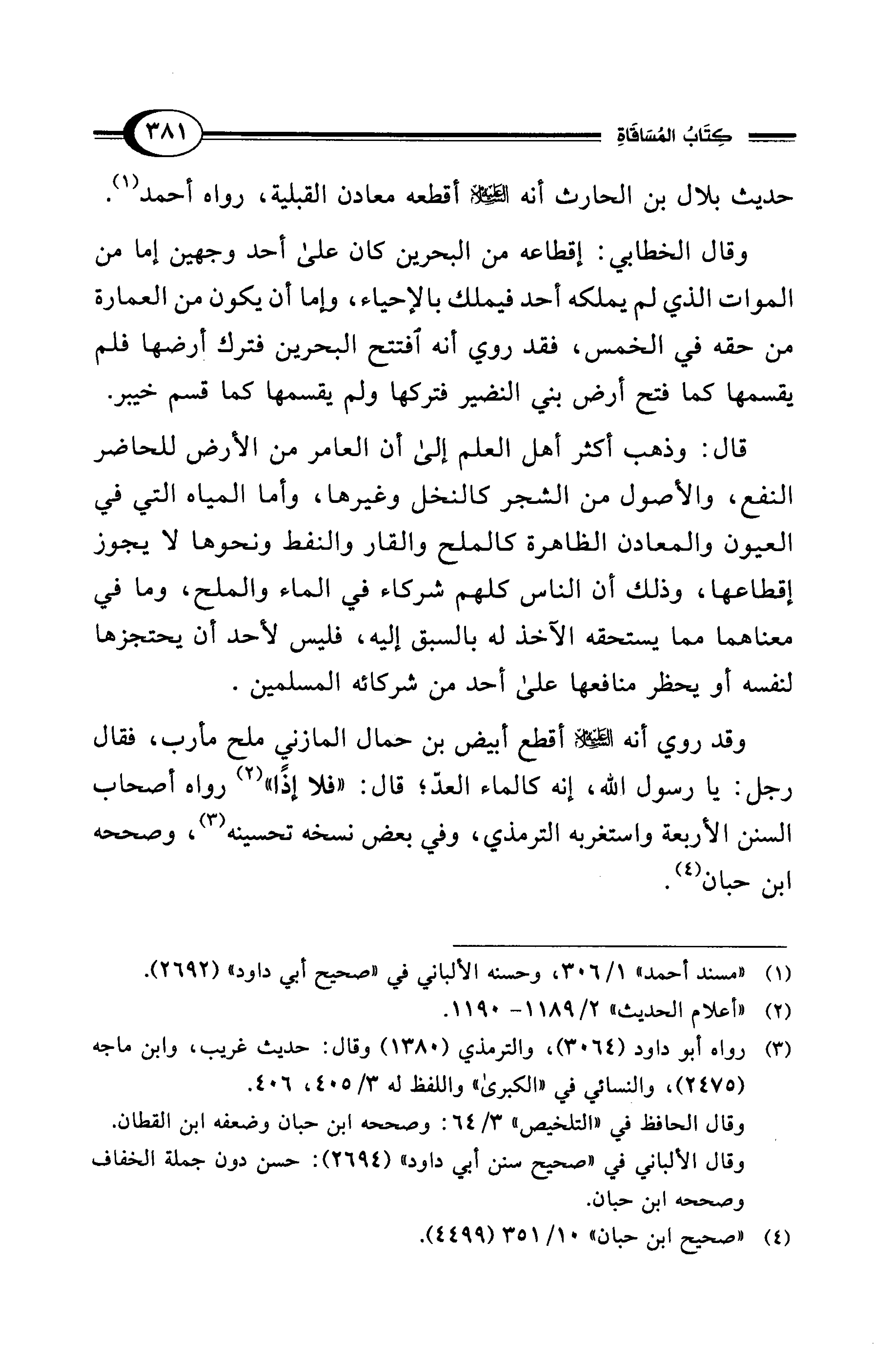 وقد روي أنه - عليه السلام - أقطع أبيض بن حمال المازني ملح مأرب، فقال رجل: يا رسول الله، إنه كالماء العدّ؛ قال: "فلا إذًا" (¬2) رواه أصحاب السنن الأربعة واستغربه الترمذي، وفي بعض نسخه تحسينه (¬3)، وصححه ابن حبان (¬4).