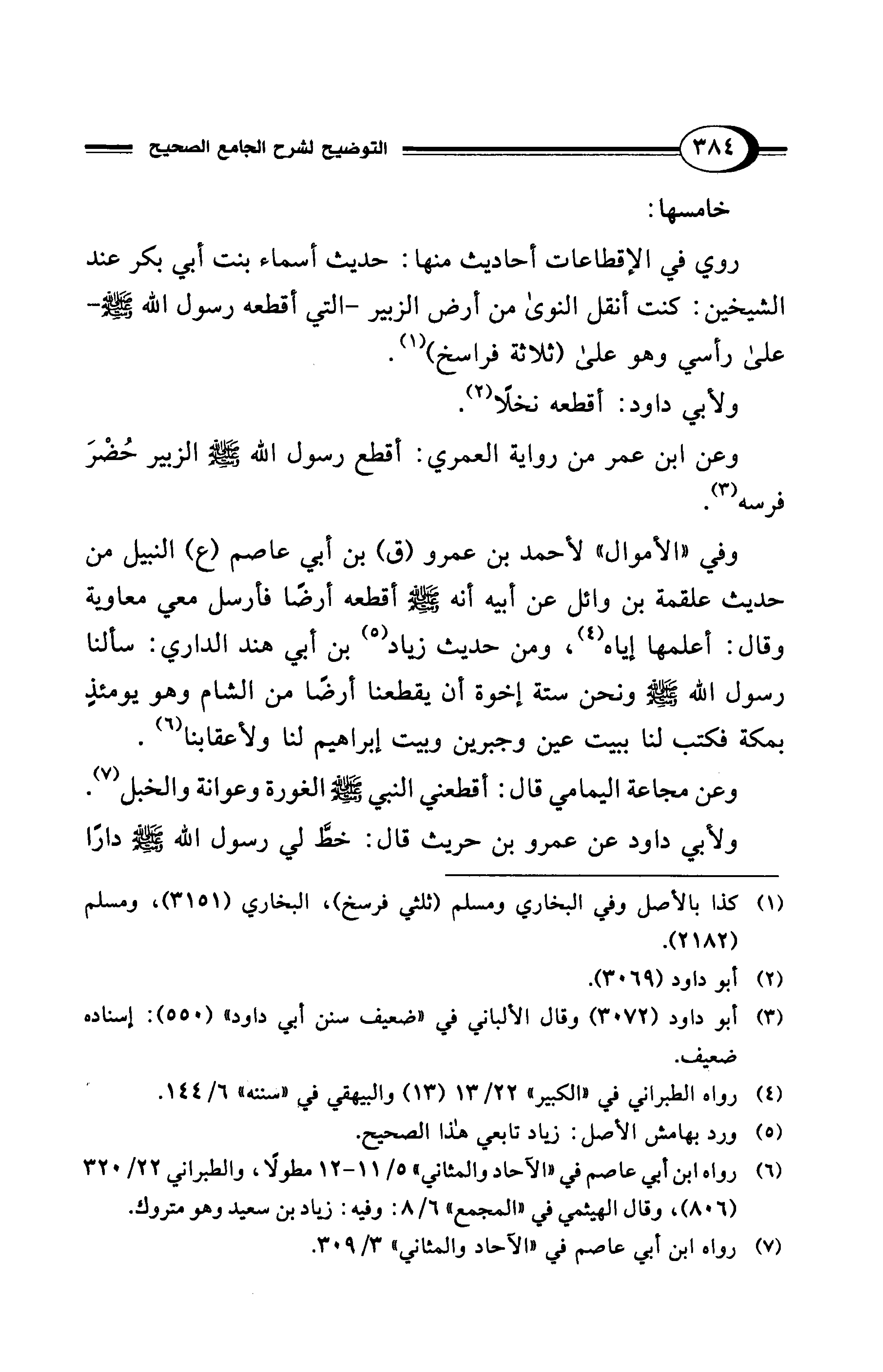 روي في الإقطاعات أحاديث منها: حديث أسماء بنت أبي بكر عند الشيخين: كنت أنقل النوى من أرض الزبير -التي أقطعه رسول الله - صلى الله عليه وسلم - على رأسي وهو على (ثلاثة فراسخ) (¬1).