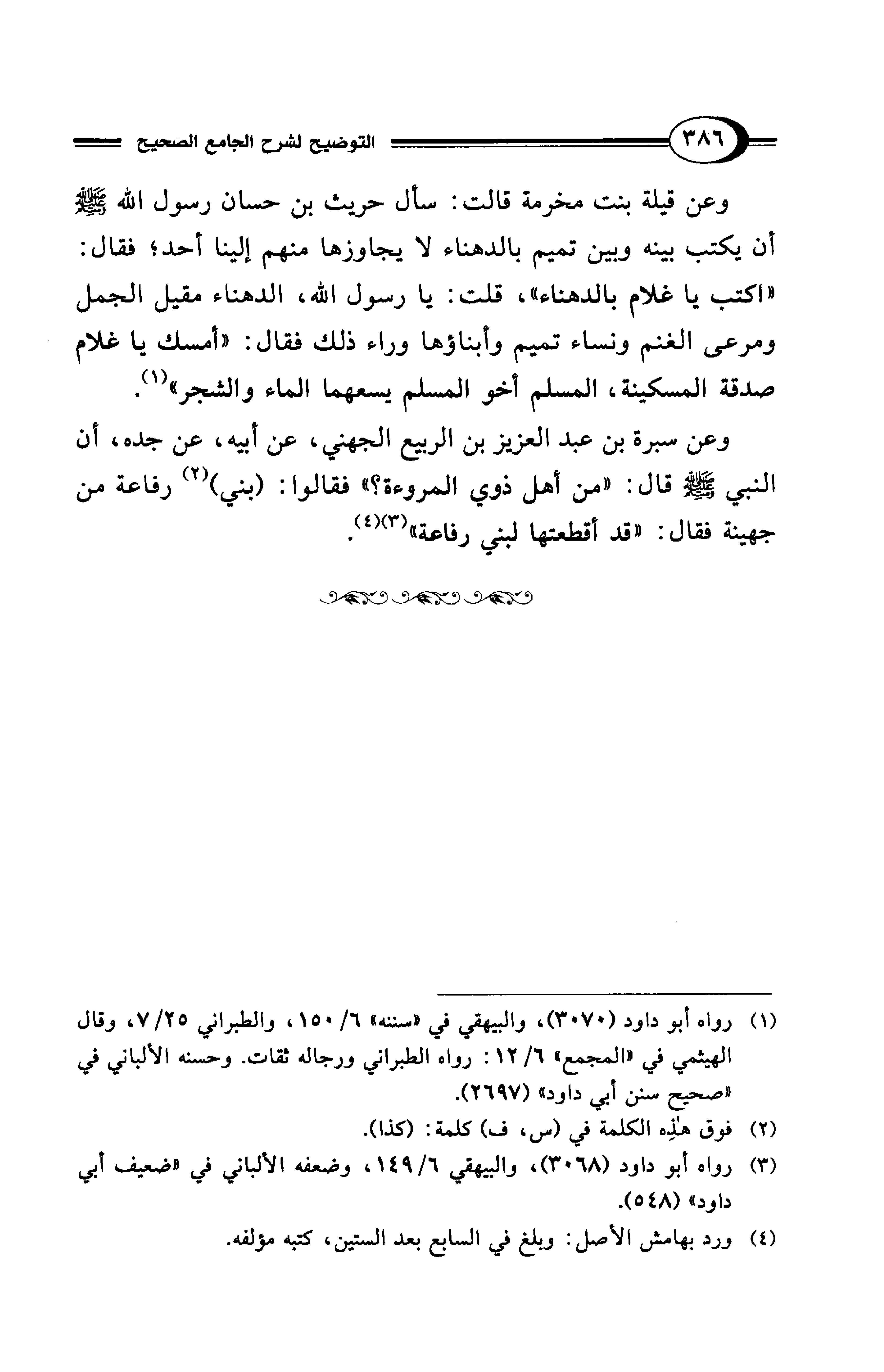 وعن سبرة بن عبد العزيز بن الربيع الجهني، عن أبيه، عن جده، أن النبي - صلى الله عليه وسلم - قال: "من أهل ذوي المروءة؟ " فقالوا: (بني) (¬2) رفاعة من جهينة فقال: "قد أقطعتها لبني رفاعة" (¬3) (¬4).