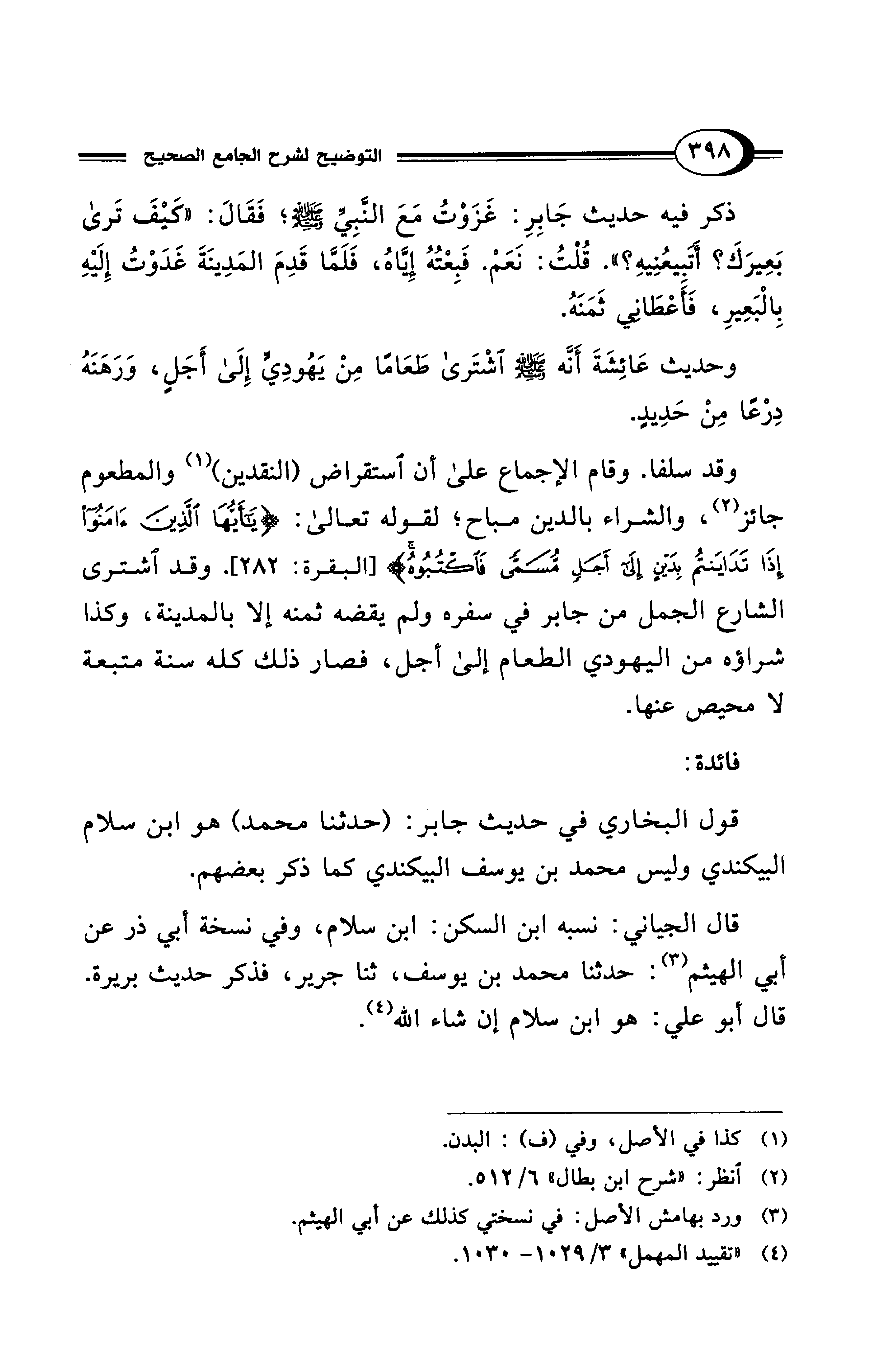 ذكر فيه حديث جَابِر: غَزَوْتُ مَعَ النَّبِيِّ - صلى الله عليه وسلم -، فَقَالَ: "كَيْفَ تَرى بَعِيرَكَ؟ أتبيعُنِيهِ؟ ". قُلْتُ: نَعَمْ. فَبِعْتُهُ إِيَّاهُ، فَلَمَّا قَدِمَ المَدِينَةَ غَدَوْتُ إِلَيْهِ بِالبَعِيرِ، فَأعْطَانِي ثَمَنَهُ.