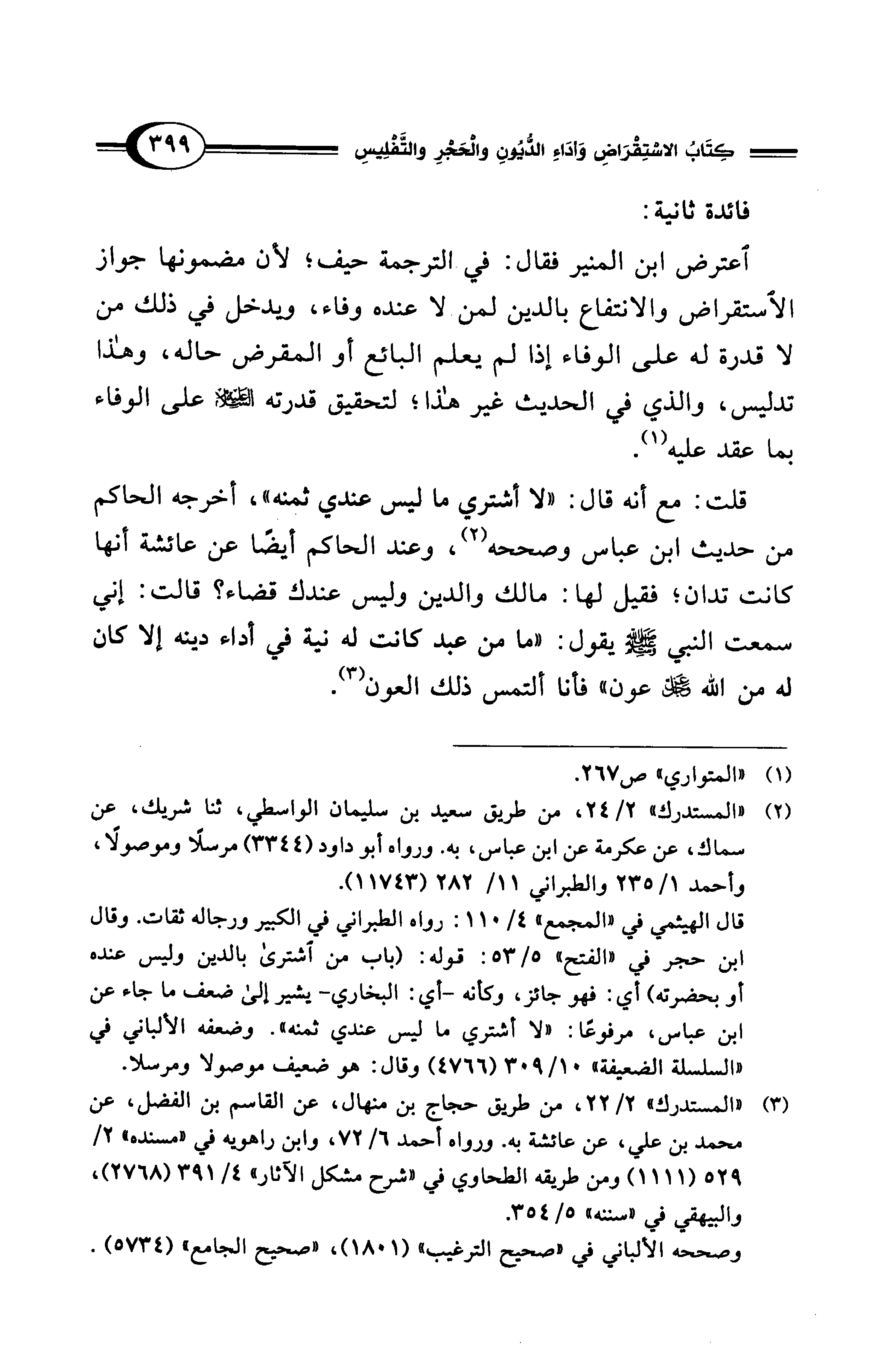 قلت: مع أنه قال: "لا أشتري ما ليس عندي ثمنه"، أخرجه الحاكم من حديث ابن عباس وصححه (¬2)، وعند الحاكم أيضًا عن عائشة أنها كانت تدان؛ فقيل لها: مالك والدين وليس عندك قضاء؟ قالت: إني سمعت النبي - صلى الله عليه وسلم - يقول: "ما من عبد كانت له نية في أداء دينه إلا كان له من الله -عز وجل- عون" فأنا ألتمس ذلك العون (¬3).