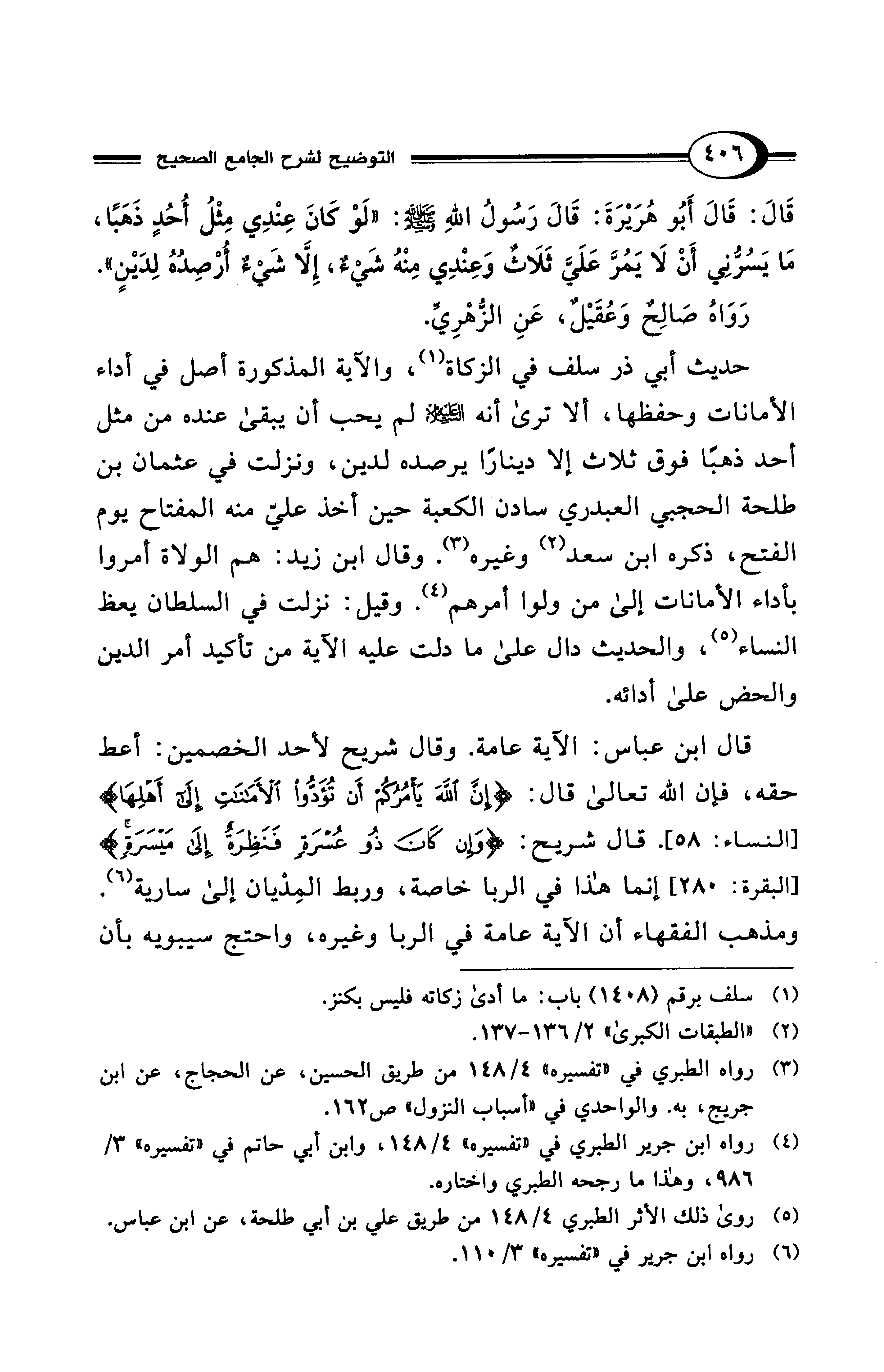 حديث أبي ذر سلف في الزكاة (¬1)، والآية المذكورة أصل في أداء الأمانات وحفظها، ألا ترى أنه - عليه السلام - لم يحب أن يبقى عنده من مثل أحد ذهبًا فوق ثلاث إلا دينارًا يرصده لدين، ونزلت في عثمان بن طلحة الحجبي العبدري سادن الكعبة حين أخذ عليّ منه المفتاح يوم الفتح، ذكره ابن سعد (¬2) وغيره (¬3). وقال ابن زيد: هم الولاة أمروا بأداء الأمانات إلى من ولوا أمرهم (¬4). وقيل: نزلت في السلطان يعظ النساء (¬5)، والحديث دال على ما دلت عليه الآية من تأكيد أمر الدين والحض على أدائه.