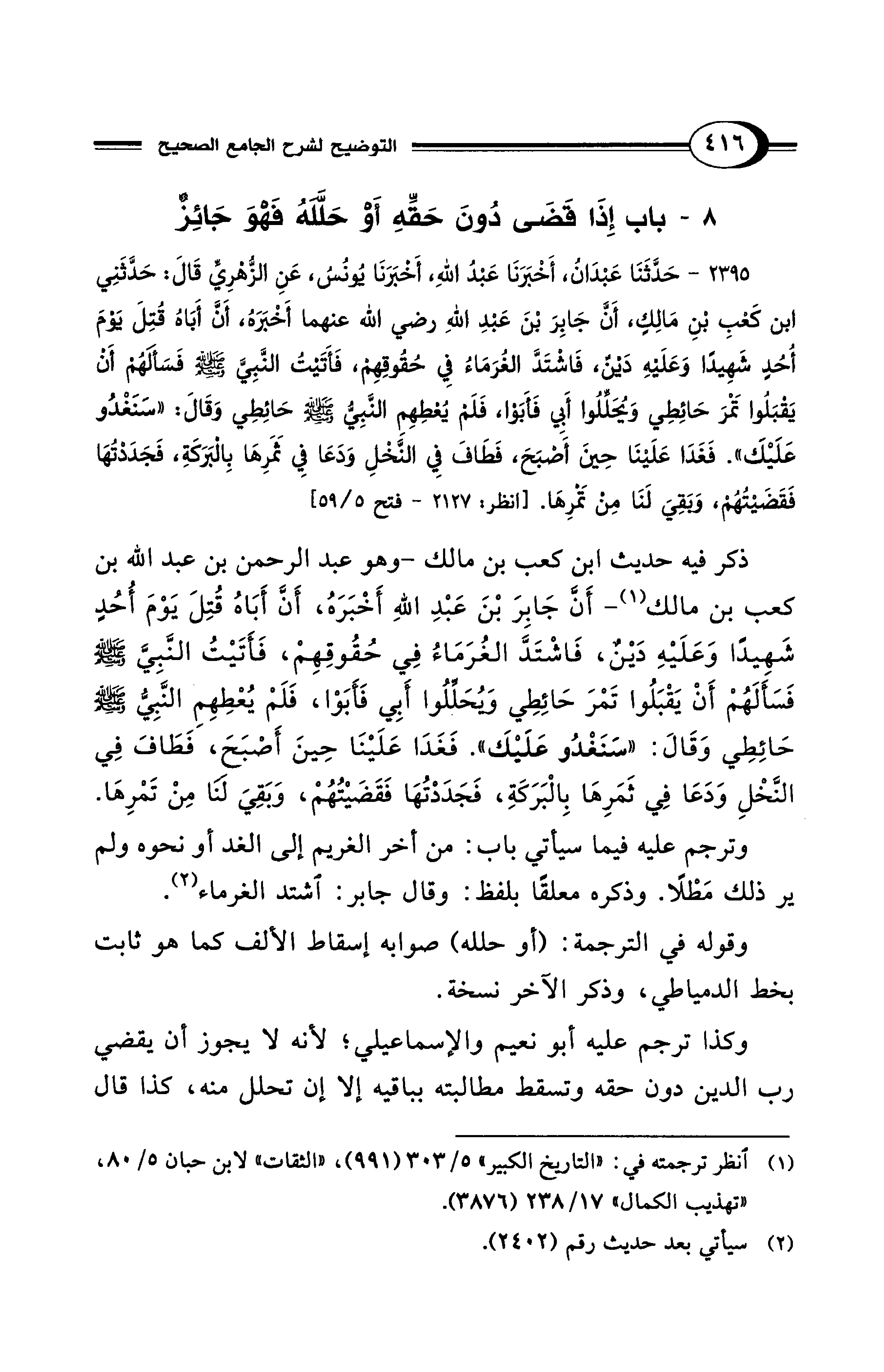 2395 - حَدَّثَنَا عَبْدَانُ، أَخْبَرَنَا عَبْدُ اللهِ، أَخْبَرَنَا يُونُسُ، عَنِ الزُّهْرِيِّ قَالَ: حَدَّثَنِي ابْنُ كَعْبِ بْنِ مَالِكٍ، أَنَّ جَابِرَ بْنَ عَبْدِ اللهِ رضي الله عنهما أَخْبَرَهُ، أَنَّ أَبَاهُ قُتِلَ يَوْمَ أُحُدٍ شَهِيدًا وَعَلَيْهِ دَيْنٌ، فَاشْتَدَّ الغُرَمَاءُ فِي حُقُوقِهِمْ، فَأَتَيْتُ النَّبِيَّ - صلى الله عليه وسلم - فَسَأَلَهُمْ أَنْ يَقْبَلُوا تَمْرَ حَائِطِي وَيُحَلِّلُوا أَبِي فَأَبَوْا، فَلَمْ يُعْطِهِمِ النَّبِيُّ - صلى الله عليه وسلم - حَائِطِي، وَقَالَ: "سَنَغْدُو عَلَيْكَ". فَغَدَا عَلَيْنَا حِينَ أَصْبَحَ، فَطَافَ فِي النَّخْلِ وَدَعَا فِي ثَمَرِهَا بِالبَرَكَةِ، فَجَدَدْتُهَا فَقَضَيْتُهُمْ، وَبَقِيَ لَنَا مِنْ تَمْرِهَا. [انظر: 2127 - فتح 5/ 59]