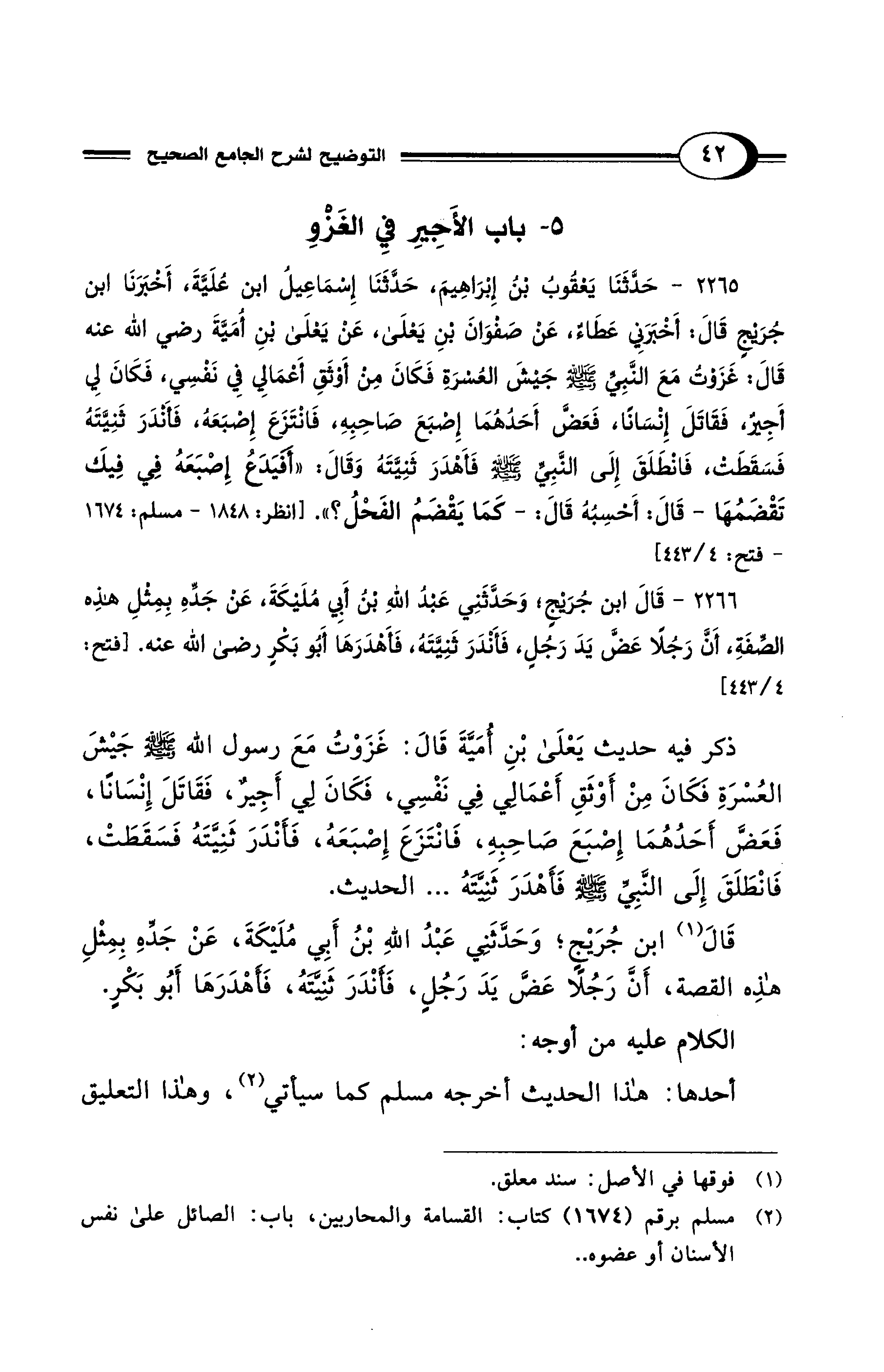 2265 - حَدَّثَنَا يَعْقُوبُ بْنُ إِبْرَاهِيمَ، حَدَّثَنَا إِسْمَاعِيلُ ابْنُ عُلَيَّةَ، أَخْبَرَنَا ابْنُ جُرَيْجٍ قَالَ: أَخْبَرَنِي عَطَاءٌ، عَنْ صَفْوَانَ بْنِ يَعْلَى، عَنْ يَعْلَى بْنِ أُمَيَّةَ رضي الله عنه قَالَ: غَزَوْتُ مَعَ النَّبِيِّ - صلى الله عليه وسلم - جَيْشَ العُسْرَةِ فَكَانَ مِنْ أَوْثَقِ أَعْمَالِي فِي نَفْسِي، فَكَانَ لِي أَجِيرٌ، فَقَاتَلَ إِنْسَانًا، فَعَضَّ أَحَدُهُمَا إِصْبَعَ صَاحِبِهِ، فَانْتَزَعَ إِصْبَعَهُ، فَأَنْدَرَ ثَنِيَّتَهُ فَسَقَطَتْ، فَانْطَلَقَ إِلَى النَّبِيِّ - صلى الله عليه وسلم - فَأَهْدَرَ ثَنِيَّتَهُ وَقَالَ: "أَفَيَدَعُ إِصْبَعَهُ فِي فِيكَ تَقْضَمُهَا -قَالَ: أَحْسِبُهُ قَالَ:- كَمَا يَقْضَمُ الفَحْلُ؟ ". [انظر: 1848 - مسلم: 1674 - فتح: 4/ 443]