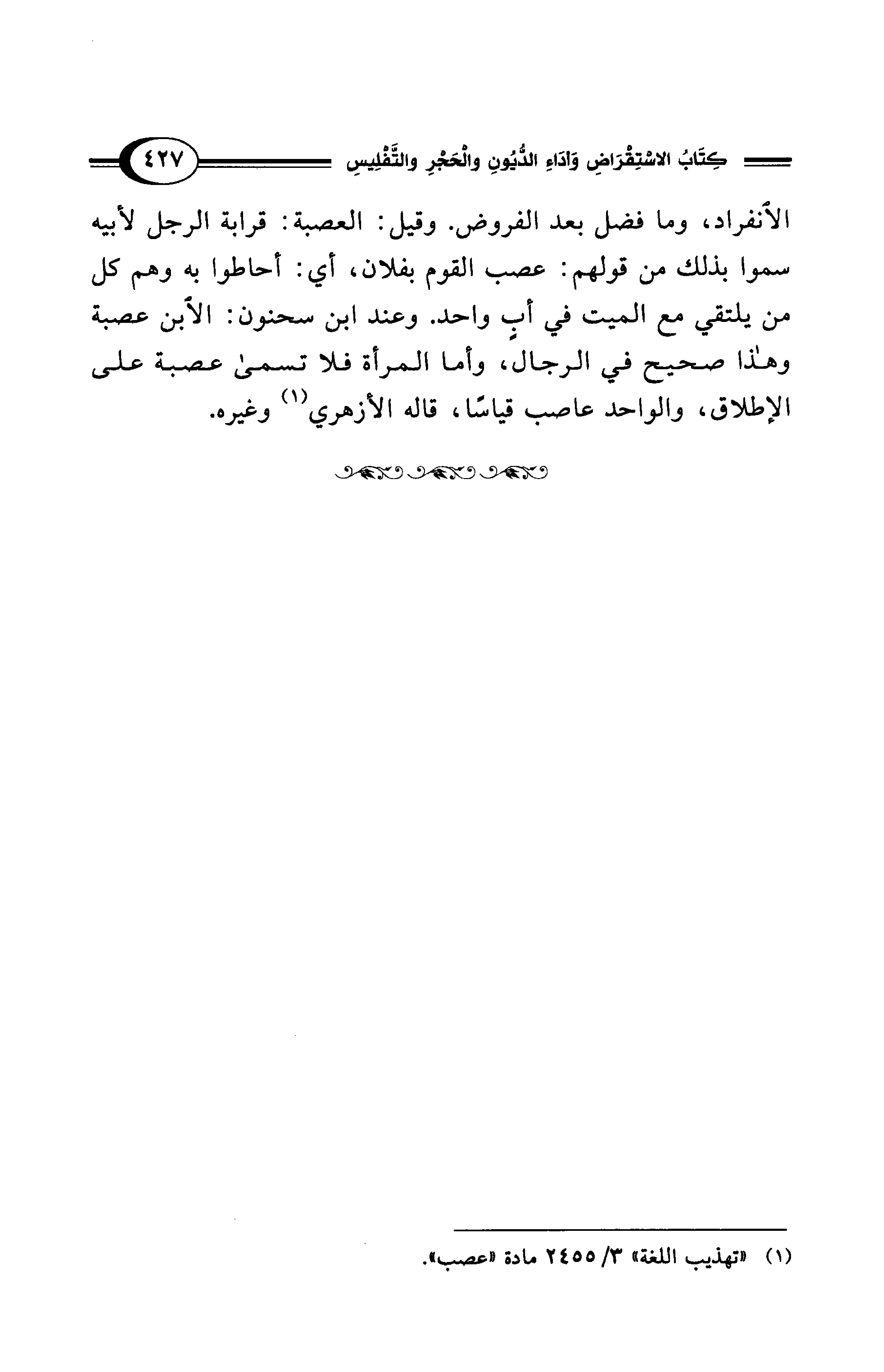 الانفراد، وما فضل بعد الفروض. وقيل: العصبة: قرابة الرجل لأبيه سموا بذلك من قولهم: عصب القوم بفلان، أي: أحاطوا به وهم كل من يلتقي مع الميت في أبٍ واحد. وعند ابن سحنون: الابن عصبة