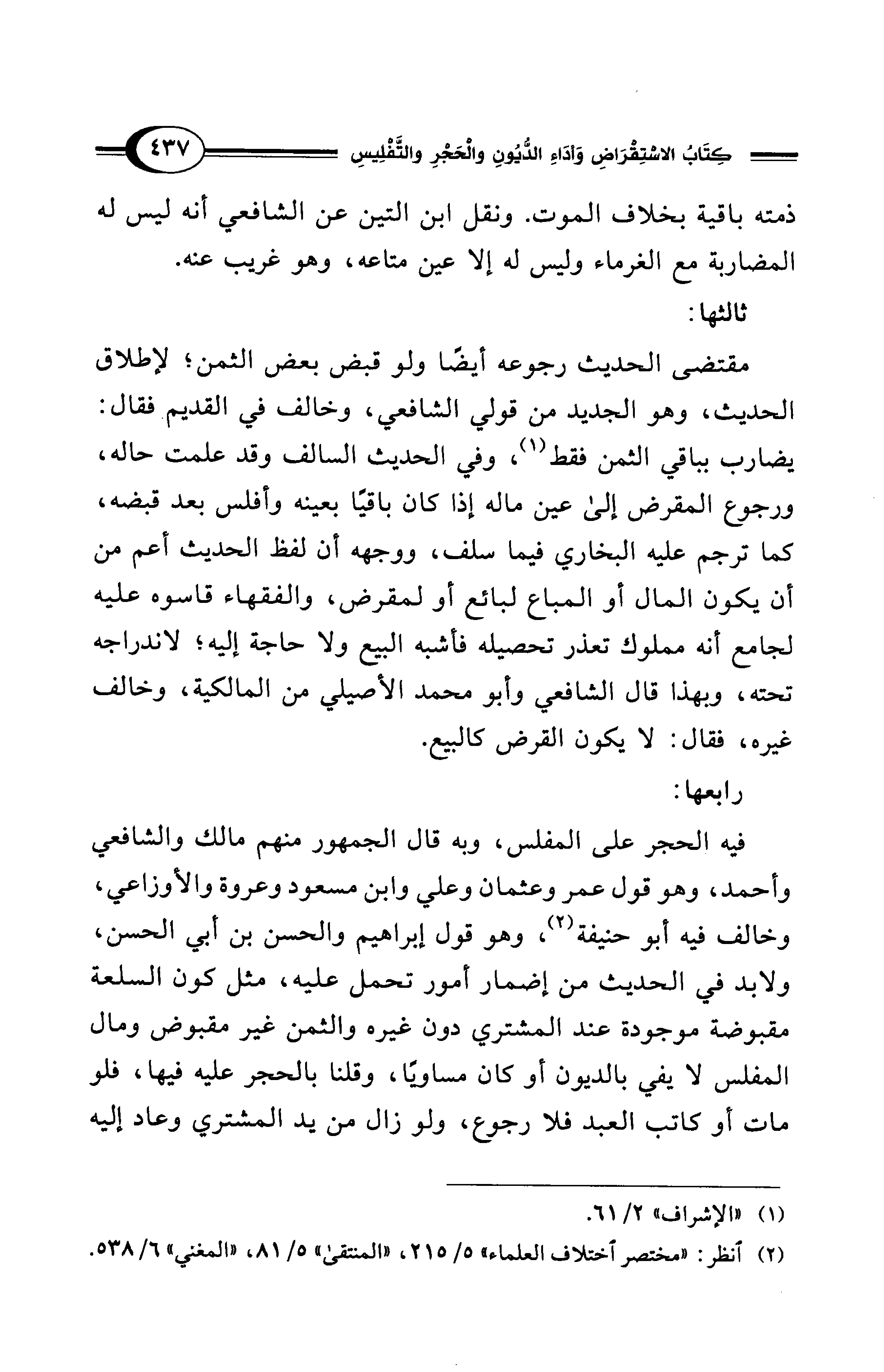 فيه الحجر على المفلس، وبه قال الجمهور منهم مالك والشافعي وأحمد، وهو قول عمر وعثمان وعلي وابن مسعود وعروة والأوزاعي، وخالف فيه أبو حنيفة (¬2)، وهو قول إبراهيم والحسن بن أبي الحسن، ولابد في الحديث من إضمار أمور تحمل عليه، مثل كون السلعة مقبوضة موجودة عند المشتري دون غيره والثمن غير مقبوض ومال المفلس لا يفي بالديون أو كان مساويًا، وقلنا بالحجر عليه فيها، فلو مات أو كاتب العبد فلا رجوع، ولو زال من يد المشتري وعاد إليه