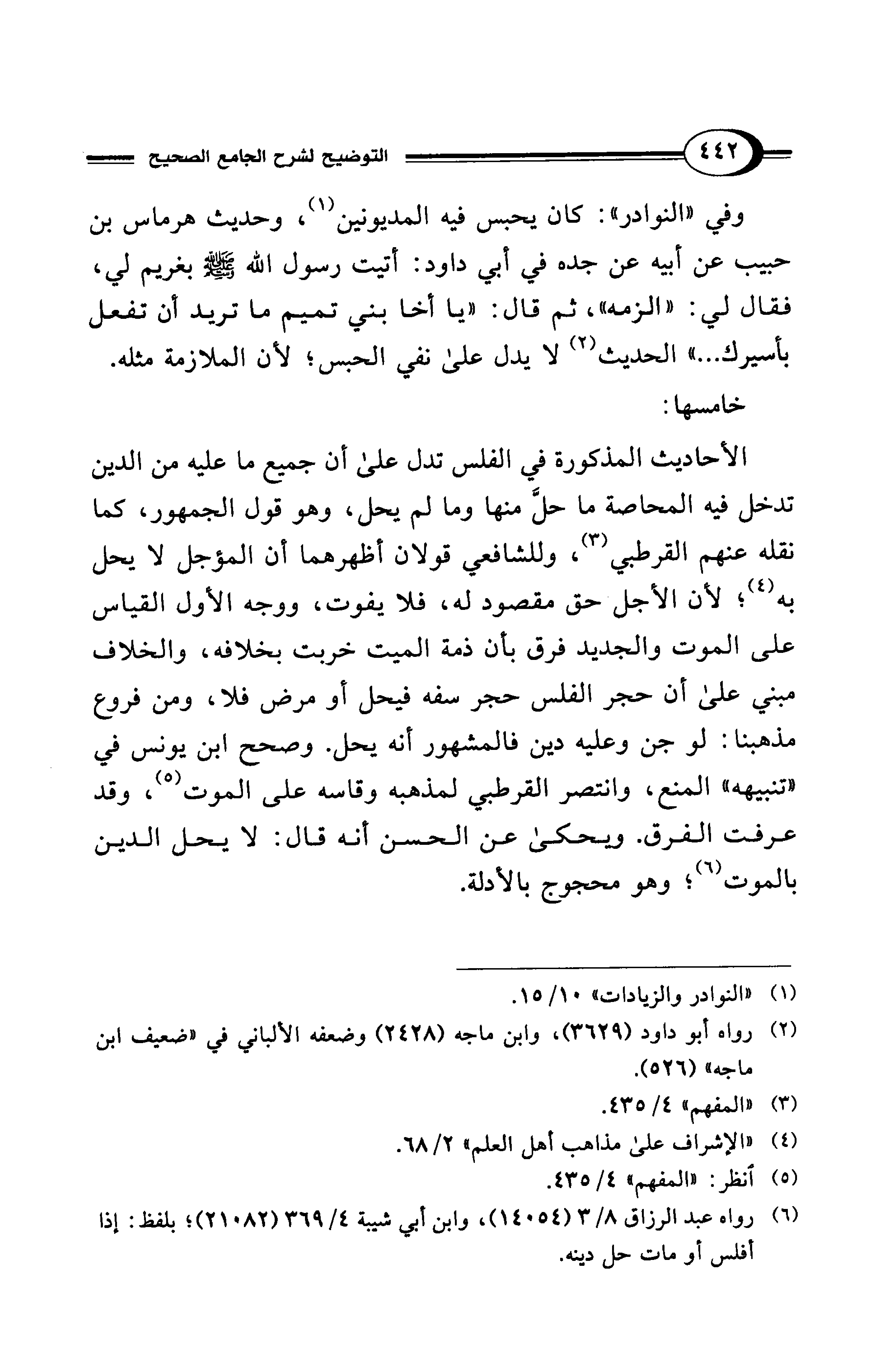 الأحاديث المذكورة في الفلس تدل على أن جميع ما عليه من الدين تدخل فيه المحاصة ما حلَّ منها وما لم يحل، وهو قول الجمهور، كما نقله عنهم القرطبي (¬3)، وللشافعي قولان أظهرهما أن المؤجل لا يحل به (¬4)؛ لأن الأجل حق مقصود له، فلا يفوت، ووجه الأول القياس على الموت والجديد فرق بأن ذمة الميت خربت بخلافه، والخلاف مبني على أن حجر الفلس حجر سفه فيحل أو مرض فلا، ومن فروع مذهبنا: لو جن وعليه دين فالمشهور أنه يحل. وصحح ابن يونس في "تنبيهه" المنع، وانتصر القرطبي لمذهبه وقاسه على الموت (¬5)، وقد عرفت الفرق. ويحكى عن الحسن أنه قال: لا يحل الدين