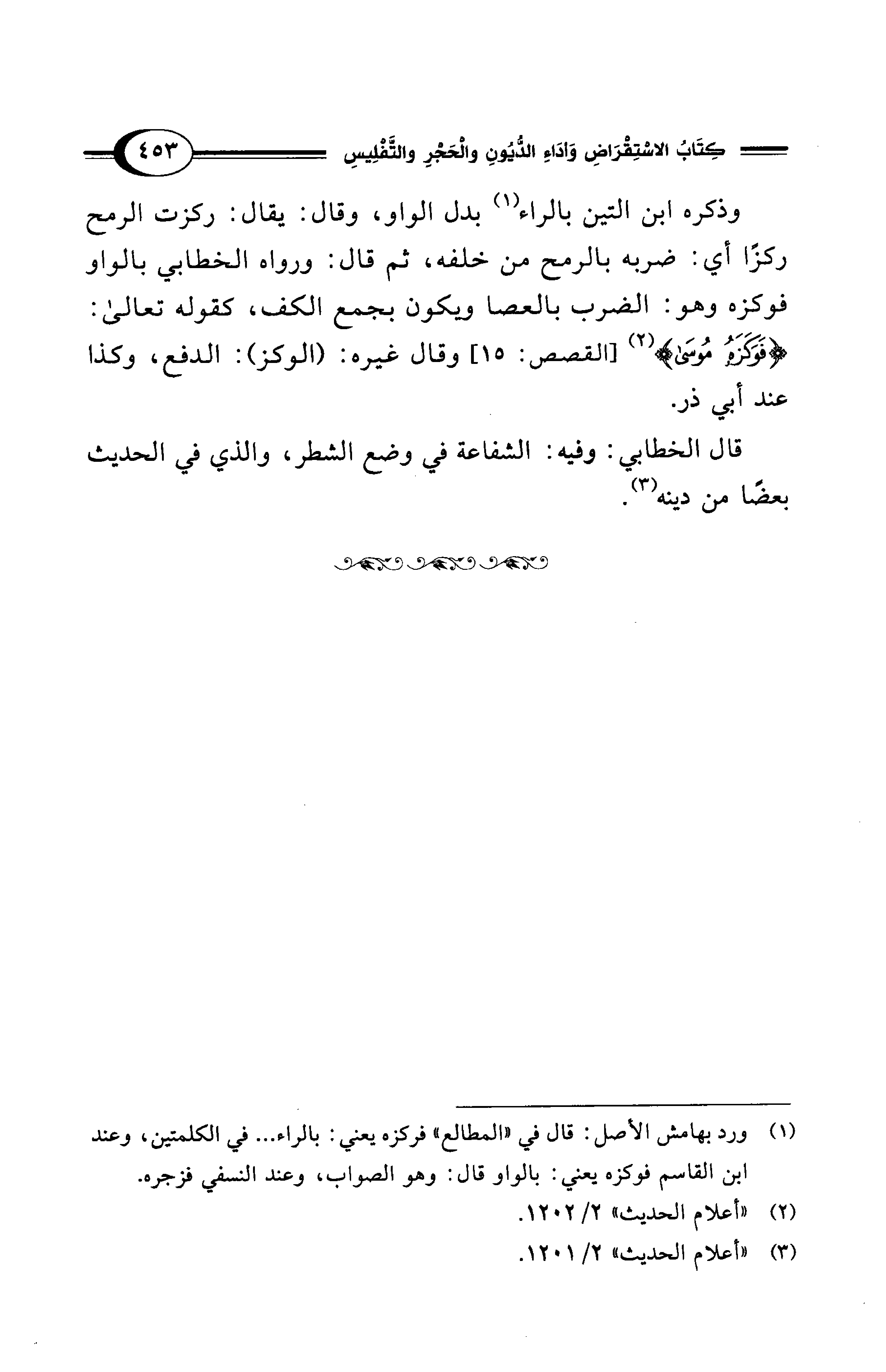 (¬1) ورد بهامش الأصل: قال في "المطالع" فركزه يعني: بالراء ... في الكلمتين، وعند ابن القاسم فوكزه يعني: بالواو قال: وهو الصواب، وعند النسفي فزجره.